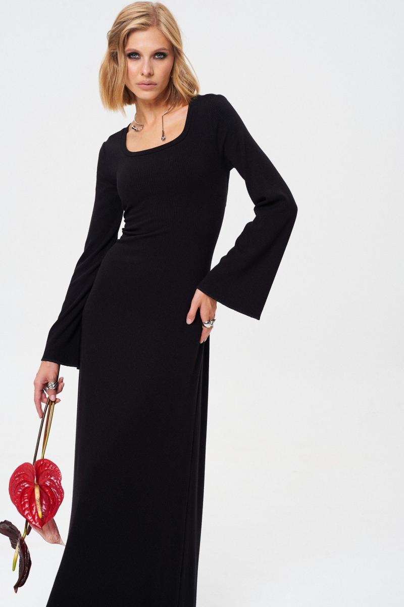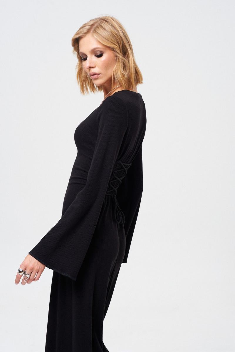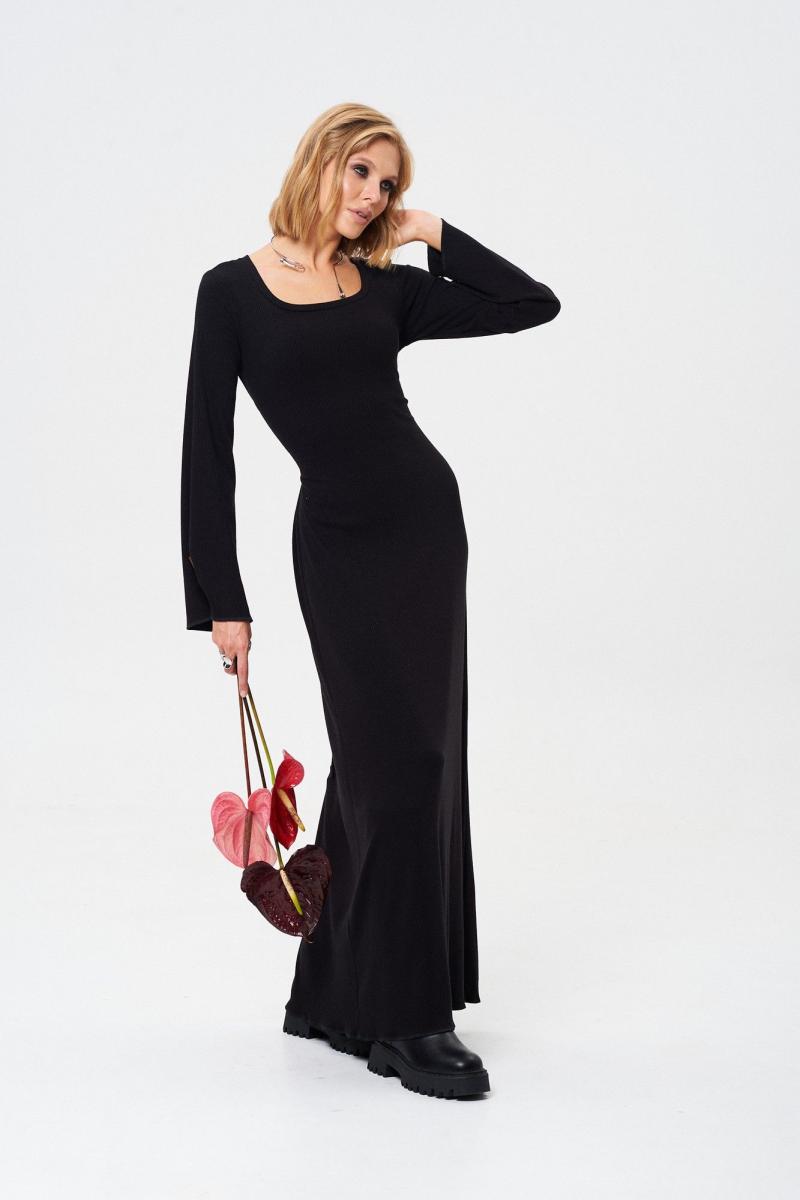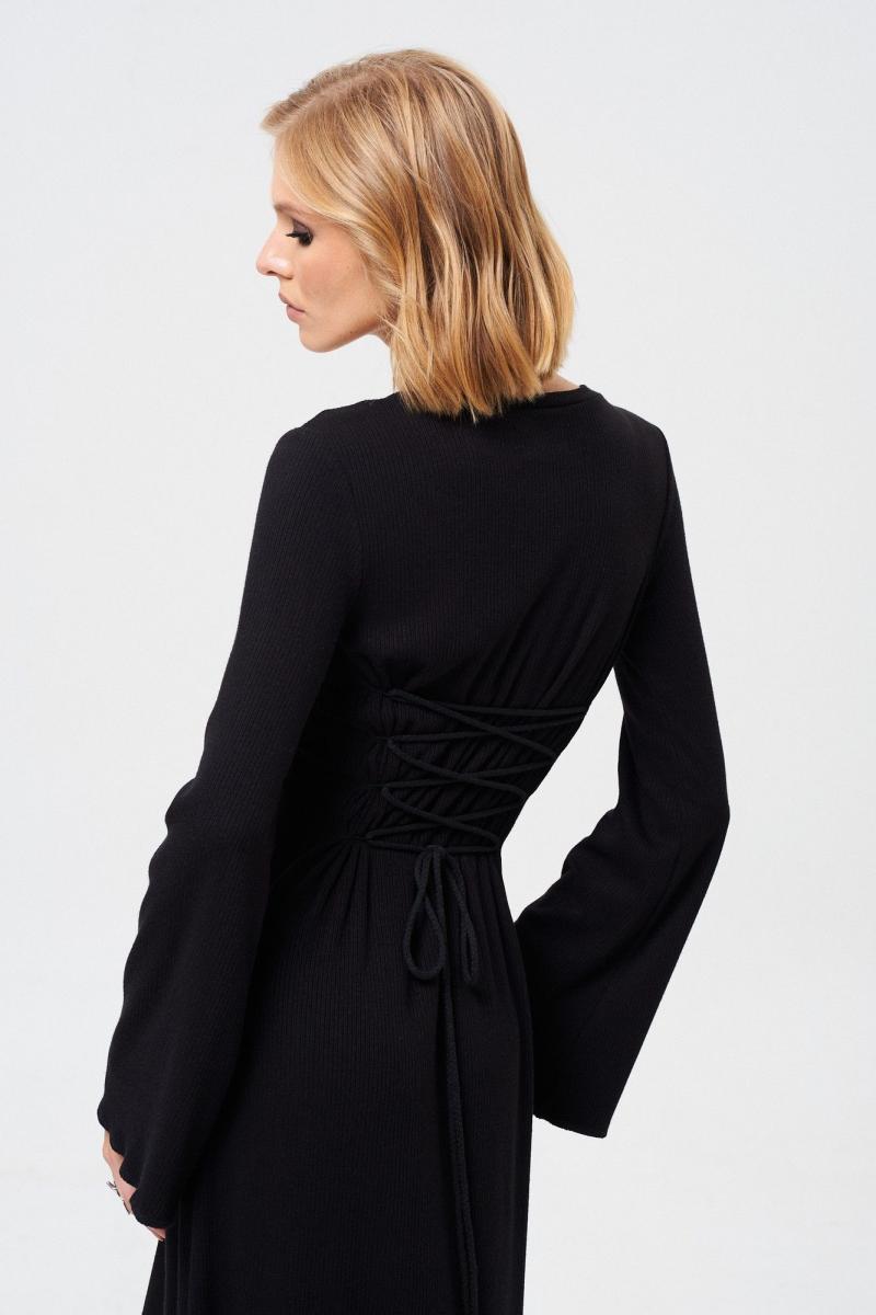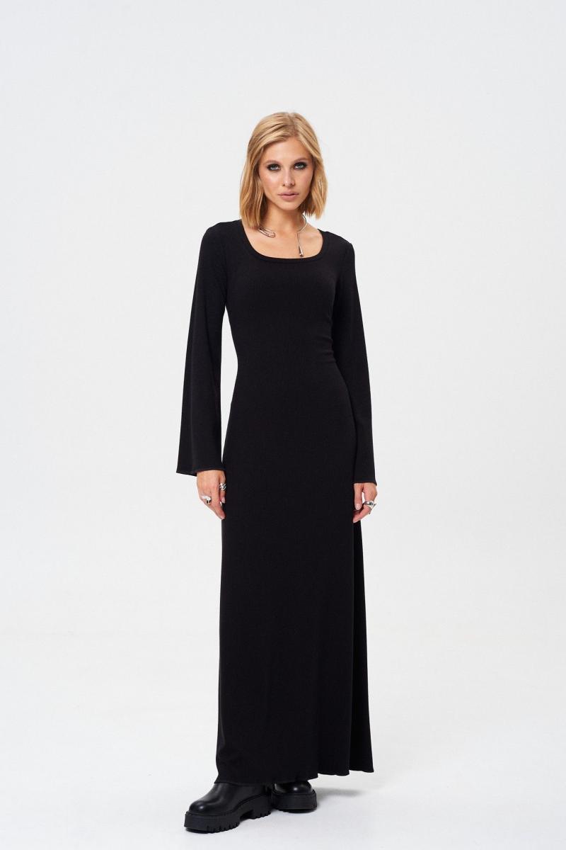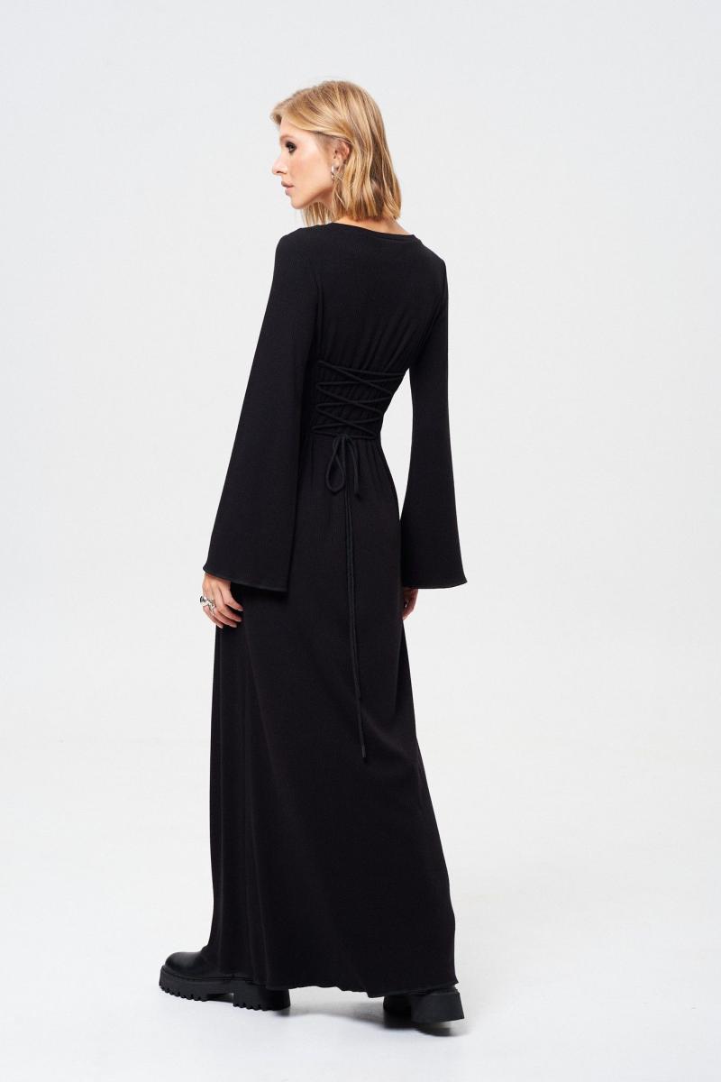 Платье прямого силуэта из трикотажа. Талия регулируется шнуровкой на спинке. Длина платья 142 см, длина рукава от основания шеи 73 см. ОГ 42-44 р-р - 86 см, 46-48 р-р - 90 см
