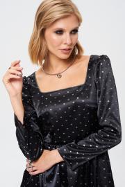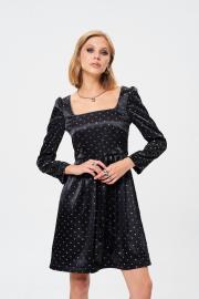 Платье из атласной ткани с принтом в мелкий серебристый бантик. Вырез декорирован тесьмой. Длина платья 88 см, длина рукава от основания шеи 62 см. ОГ 42 р-р - 82 см, 44 р-р - 86 см, 46 р-р - 90 см, 48 р-р - 94 см ОТ 42 р-р - 70 см, 44 р-р - 74 см, 46 р-р - 78 см, 48 р-р - 82 см