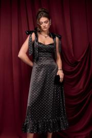 Платье из премиального атласа с блестящим принтом в мелкий бантик. Банты на шлейках съёмные. Молния по спинке. Чашки в лифе съёмные. Длина платья 133 см. 42 р-р ОГ 82-84 см, ОТ 69-71 см. 44 р-р ОГ 86-88 см, ОТ 73-75 см. 46 р-р ОГ 90-92 см, ОТ 77-79 см. 48 р-р ОГ 94-96 см, ОТ 81-83 см.