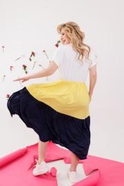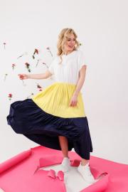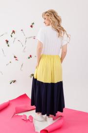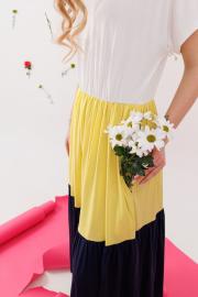 Уютное трехцветное платье в пол из хлопковой ткани полусвободного силуэта с коротким цельнокроенным рукавом. На талии собрано на резинку. Изделие без подклада.