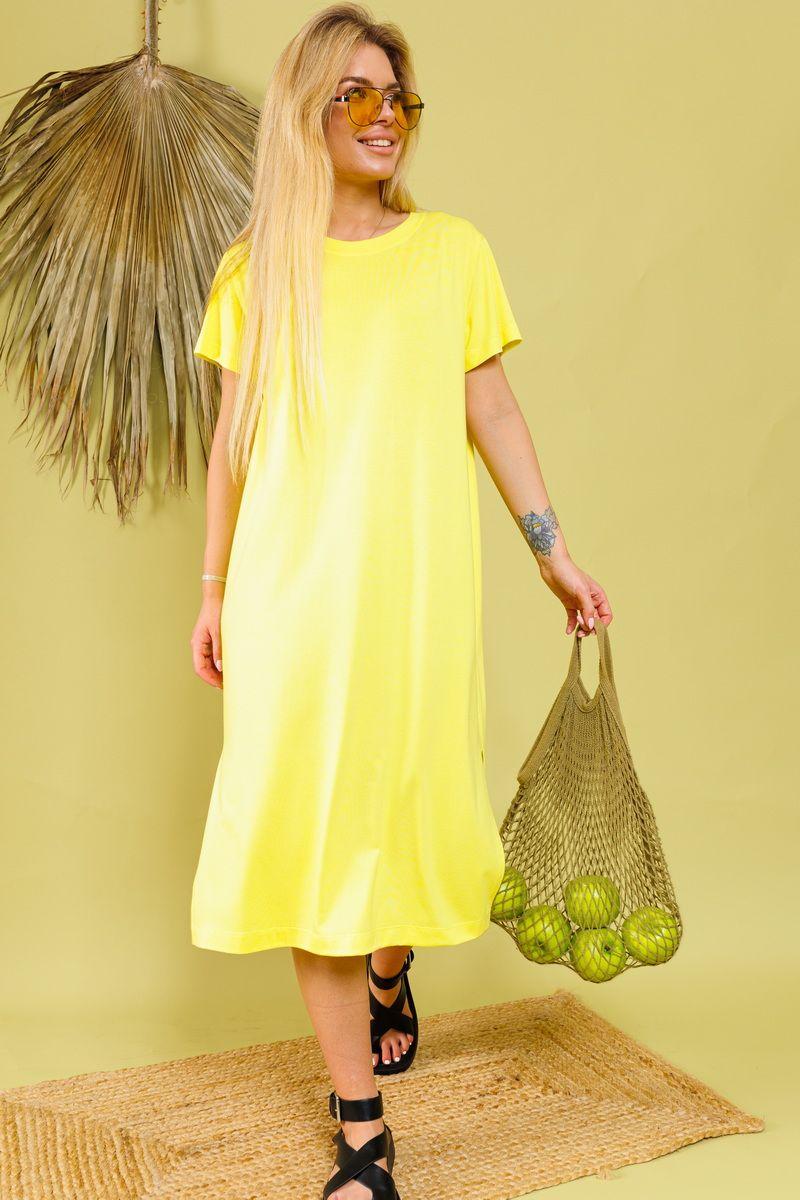 Платье свободного прямого кроя из вискозного полотна. Рукав втачной, планка по горловине. Вырез круглый. Низ изделия и рукавов имеют плоский шов. В боковых швах разрезы.