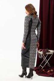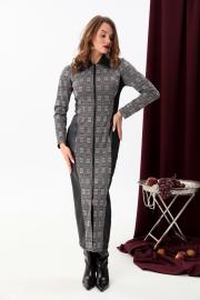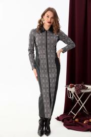 Утончённое комбинированное платье прилегающего силуэта длиной макси. На деталях полочек фигурные рельефы. Застежка платья на разъемную молнию в среднем шве полочки. На спинке средний шов и фигурные рельефы.Рукав реглан длинный и двухшовный. Вырез горловины округлой формы, оформленный отложным воротником.