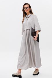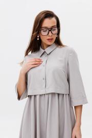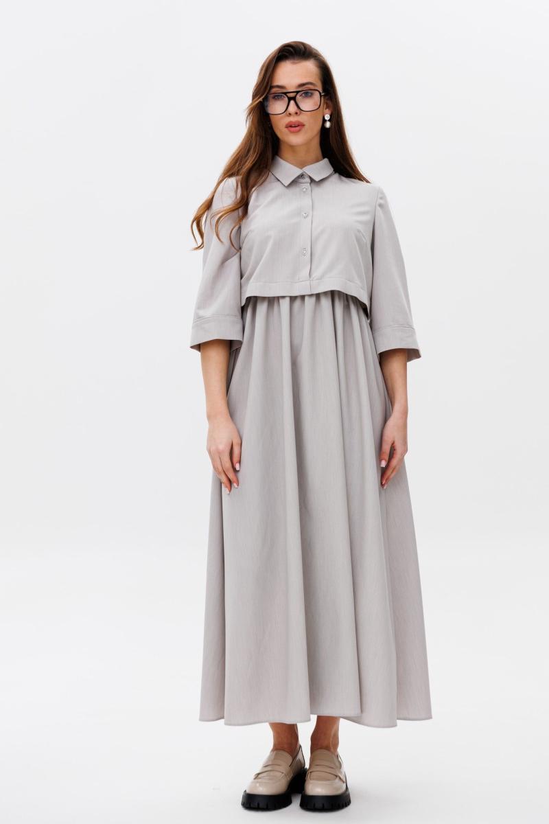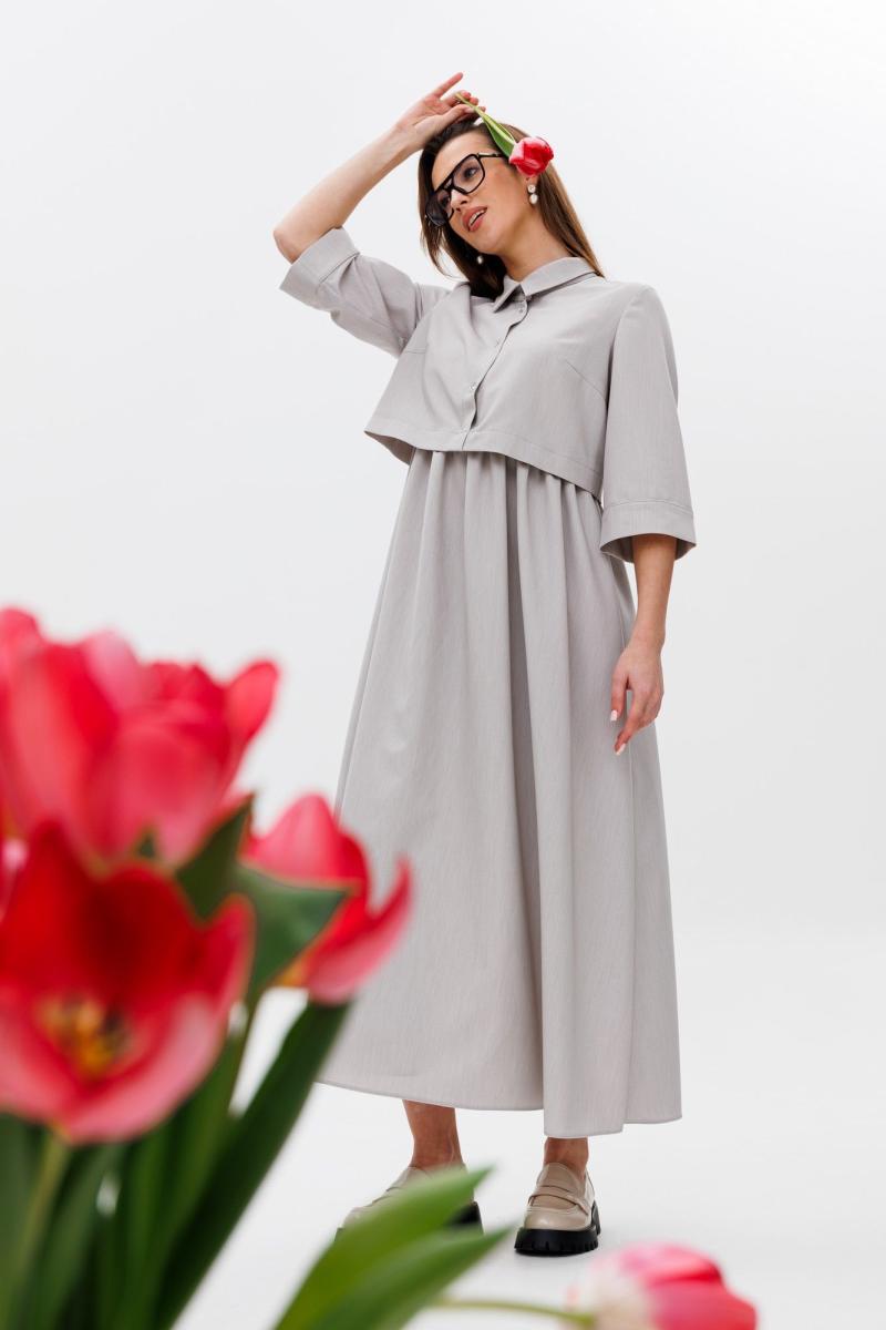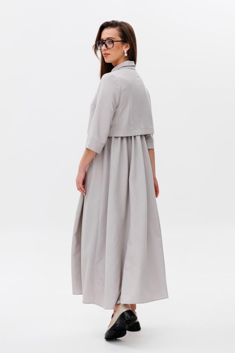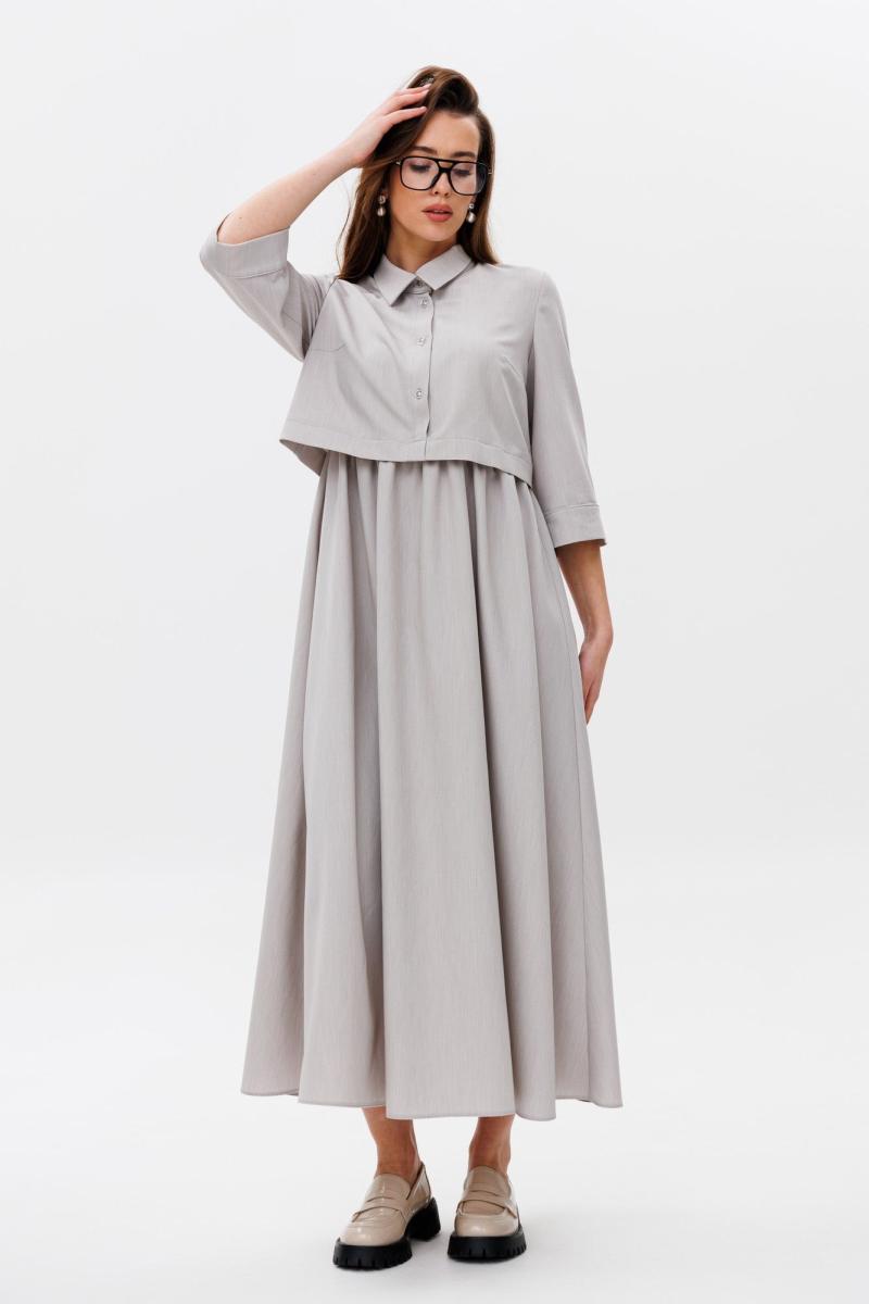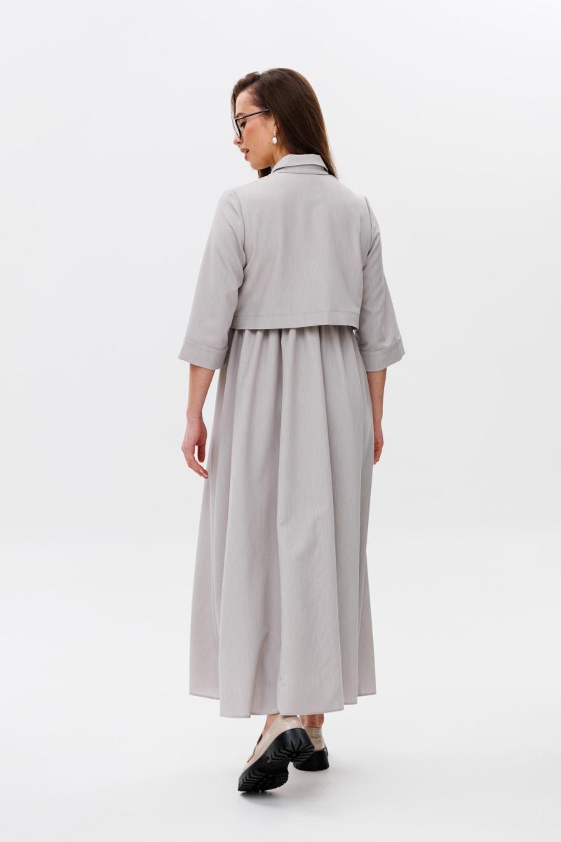 Воздушное платье, состоящее из лифа и юбки, имитирующее костюм-двойку. Лиф прямого кроя с втачным рукавом три четверти. Горловина обработана рубашечным воротником с отрезной стойкой. Застёжка центральная на пуговицы. По талии собрано на резинку. Юбка А-силуэта.