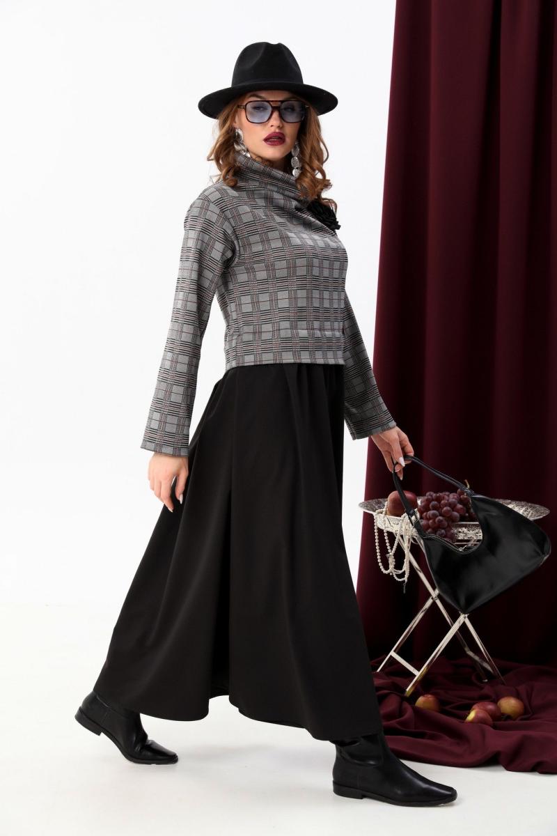 Платье прямого силуэта, состоящее из комбинации двух тканей - основной и отделочной. Воротник цельнокроеный хомут. Рукав одношовный, втачной, длинный. Нижняя юбка из отделочной ткани, со сборкой по линии талии. В виде отделки по левой части переда декоративный цветок из отделочной ткани.