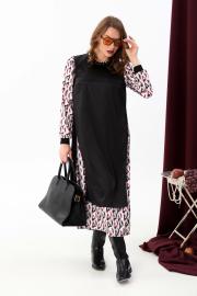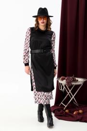 Платье комбинированное, состоящее из двух частей: верхней и нижней. Нижняя часть: платье А-силуэта свободного прямого кроя с втачным рукавом. По окату рукава сборка, по низу манжет. По спинке шов. Горловина полукруглая, застегивается на пуговицу по спинке.Верхняя часть - имитация удлиненного жилета прямого кроя. В комплект к платью идёт ремень из экокожи, может отличаться от заявленного на фото.