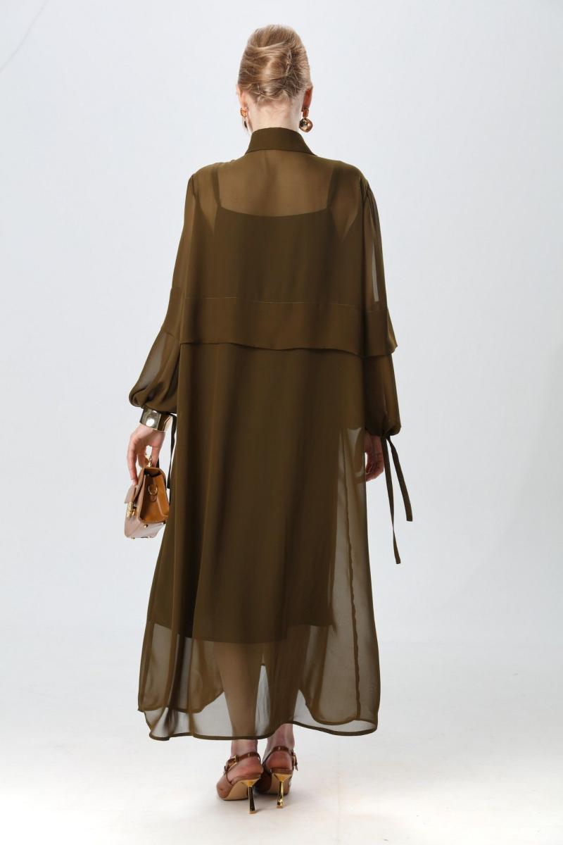 Платье состоит из двух платьев: нижнего и верхнего. Верхнее платье макси с центральной отрезной застёжкой на потайную планку на петли и пуговицы.По переду и спинке цельнокроеные складки на уровне талии. Рукав втачной,одношовный рубашечноно типа. По низу рукава пробиты петли и вставлена завязка для фиксации сборки . Воротник рубашечный стояче отложной. Нижнее платье комбинация на регулируемых бретелях.