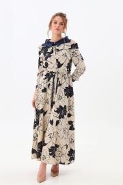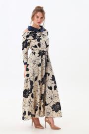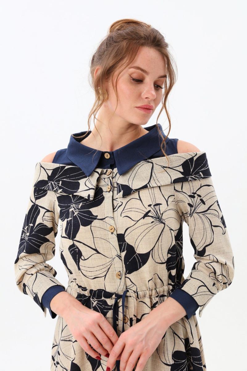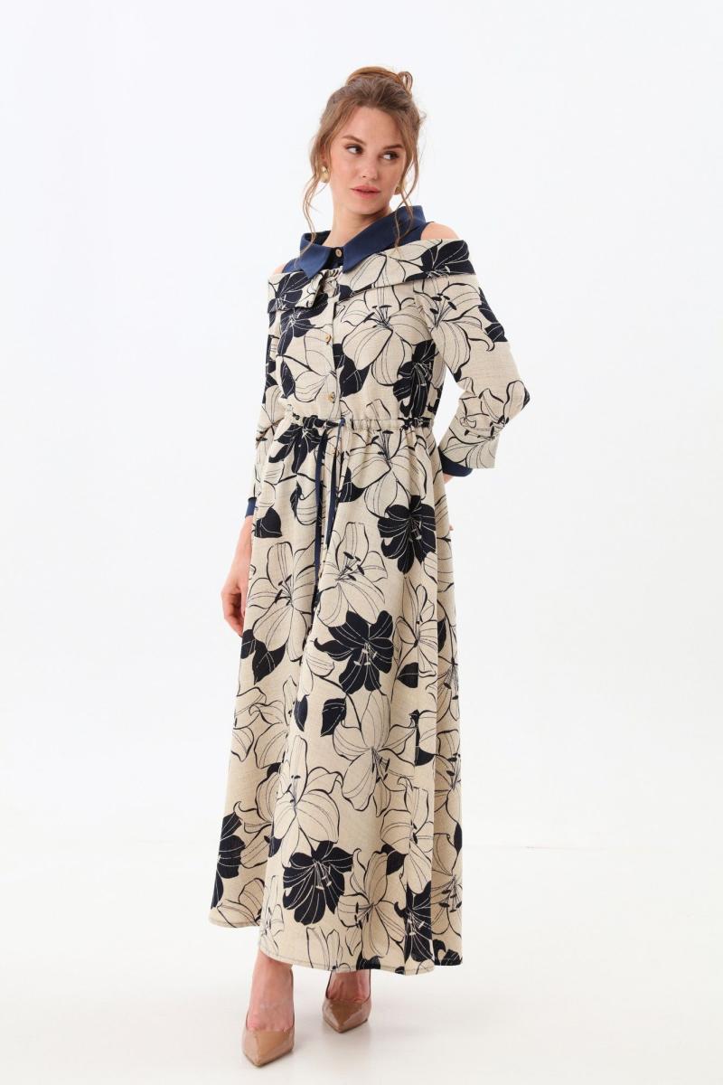 Эксклюзивное платье длиной макси полуприлегающего силуэта. Отрезное по линии талии, на кулисе. Юбка расклешена к низу. Полочка с центральной застежкой на петли и пуговицы, край борта обработан притачной планкой. Вырез горловины обработан отложным воротником со стойкой и имитацией рубашечного воротника из контрастой по цвету отделочной ткани. Рукав втачной по низу проймы. Низ рукава оформлен двойной манжетой.