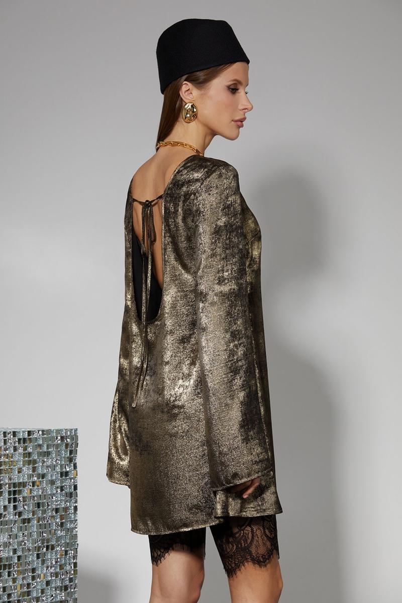 Стильное платье длиной выше колена, немного расширенное книзу. Свободное в талии и бедрах. Втачной длинный рукав, расширенный книзу. Горловина круглая. Глубокий вырез на спинке, который фиксируется завязками в области лопаток. Платье без подкладки. Длина изделия 83/86 Длина рукава 66