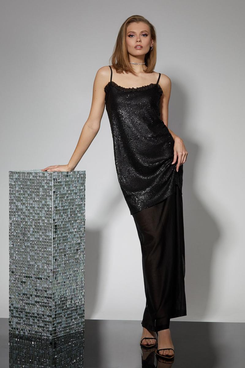 Платье прямого силуэта на бретелях, которые легко регулируются. Длина макси. Перед и спинка изделия прямые. Верх платья выполнен их матовых пайеток, низ изделия выполнен из тонкого прозрачного хлопка. Разрез сзади. Длина изделия 136