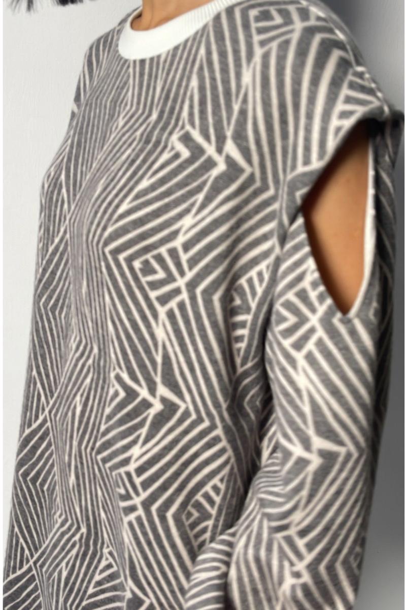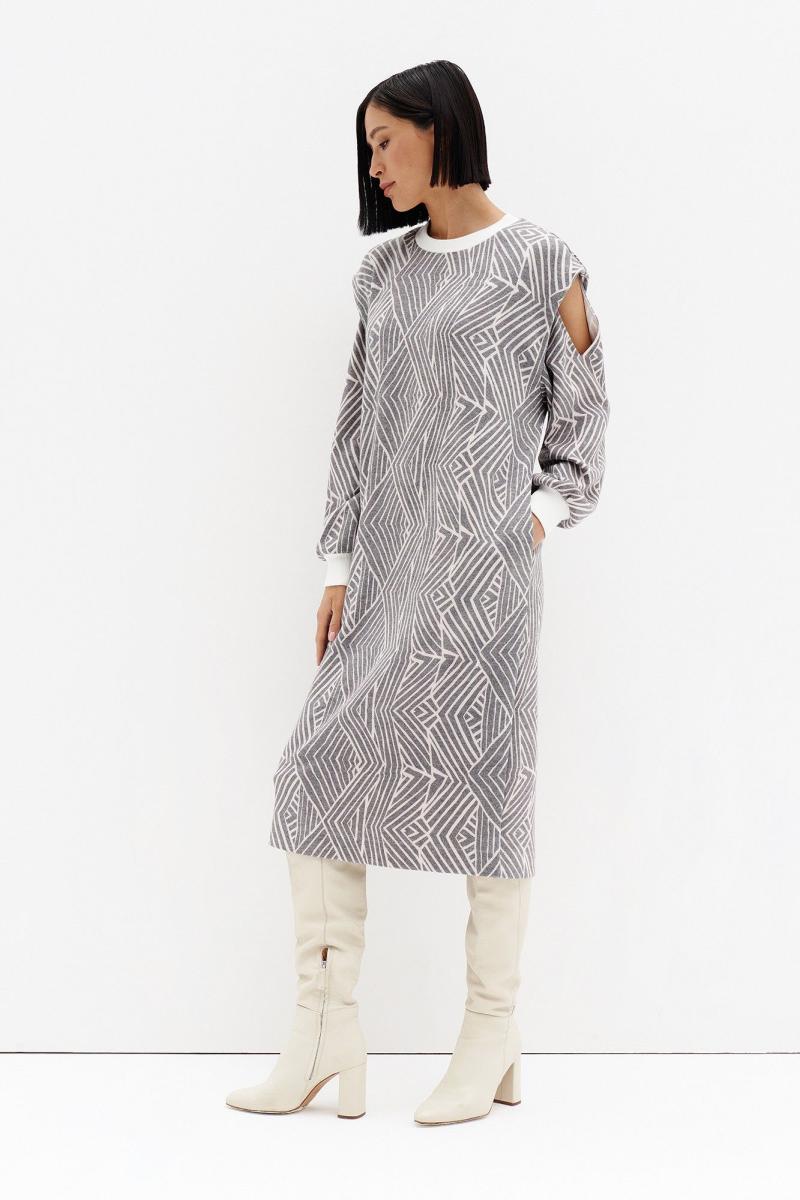 Трикотажное платье свободного кроя с акцентом на плечи. Молочные трикотажные довязы освежают образ.