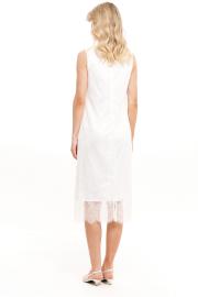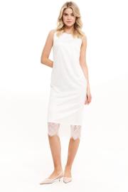 Длина миди делает платье универсальным вариантом для различных случаев – от деловых встреч до вечерних мероприятий. Оно идеально впишется в базовый гардероб, дополняя как классические, так и современные образы. Отсутствие рукавов делает его идеальным для весенне-летнего сезона, обеспечивая комфорт даже в жаркую погоду. Пройма обработана декоративной тесьмой, которая гармонично дополняет изысканную горловину, украшенную жемчужным декором.