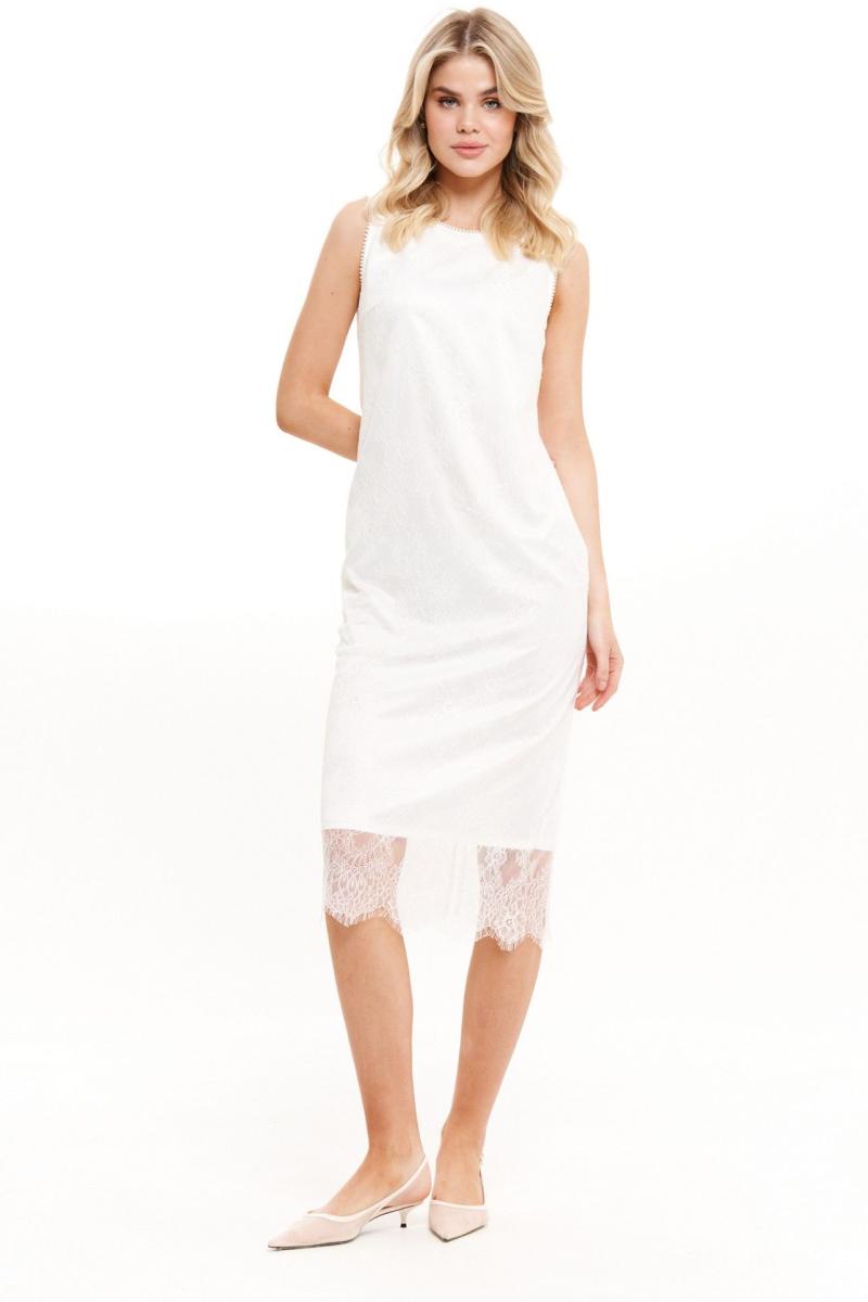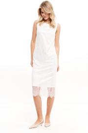 Передняя часть платья дополнена нагрудными вытачками, подчёркивающими естественные линии силуэта. На спинке предусмотрена потайная молния, обеспечивающая удобную посадку, а также небольшой разрез, который добавляет лёгкости и свободы движений. Молочный оттенок подчеркивает утончённость образа, делая его идеальным как для офисных будней, так и для торжественных событий.