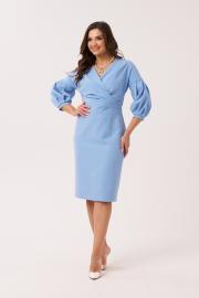 Это элегантное женское платье голубого оттенка, выполненное из смесовой ткани, идеально подходит для повседневной носки. Платье на запах с изящными складками создает легкий и романтичный образ, подчеркивая женственность и комфорт. Свободный силуэт платья обеспечивает удобство и свободу движений. V-образный вырез на запах визуально удлиняет шею и добавляет изысканности. Отрезной пояс по линии талии подчеркивает фигуру, а дополнительно притаченный пояс позволяет регулировать посадку. Спинка со средним швом и двумя талиевыми вытачками для лучшей посадки. В среднем шве спинки расположена потайная застежка-молния для удобства надевания. Шлица в среднем шве спинки добавляет свободы движений и стильный акцент. Рукава втачные со спущенным плечом, создающие расслабленный вид. Низ рукава со складками обработан притачной манжетой для аккуратного завершения. Это платье станет отличным выбором для повседневной носки — его можно легко сочетать с различными аксессуарами и обувью. Легкость ткани обеспечивает комфорт в течение всего дня, а стильный дизайн позволяет выглядеть элегантно в любой ситуации. Платье подчеркнет индивидуальность и вкус современной женщины, делая ее образ ярким и запоминающимся.