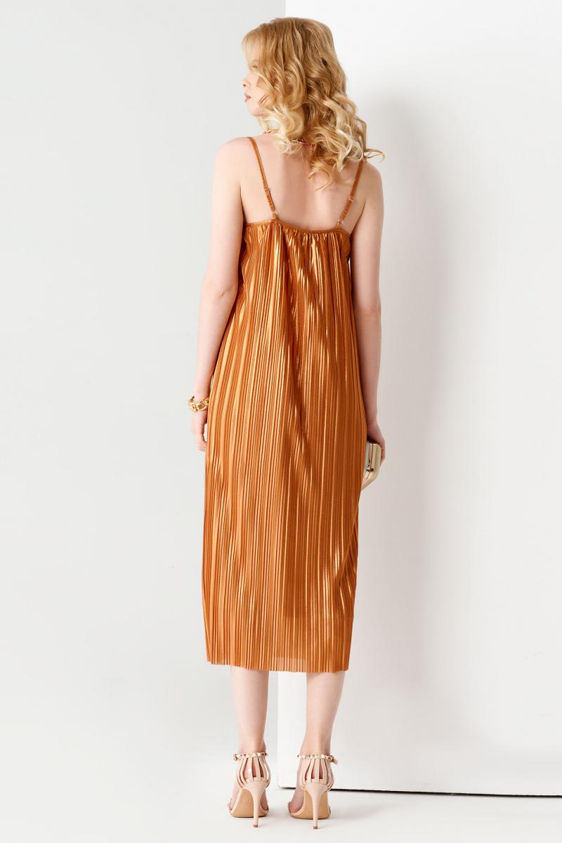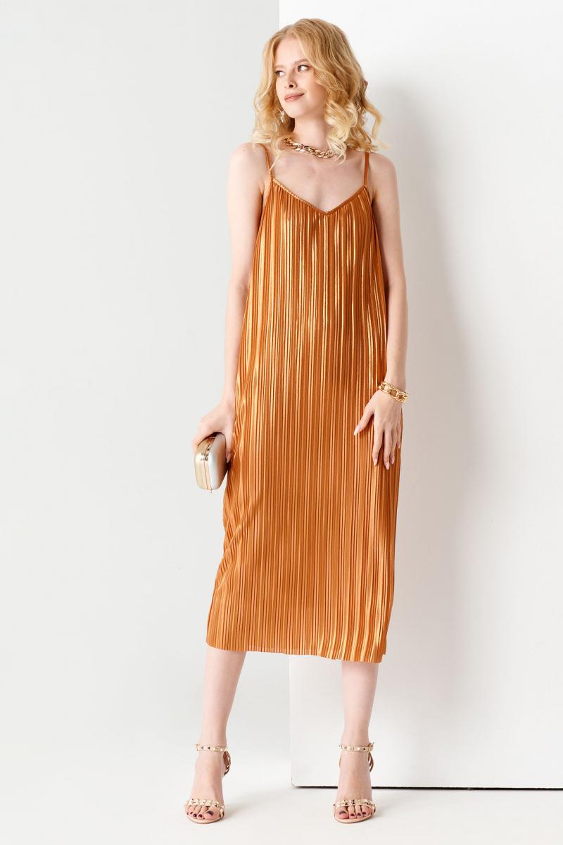 Плиссированное платье в складку с мелким шагом блестит в лучах света, благодаря специальному золотистому напылению на струящейся утонченной ткани. Прямой фасон успешно подчеркивает преимущества фигуры. Летнее платье с бретельками регулируемой длины изящно открывает линии шеи, плеч, рук, верхней части груди.