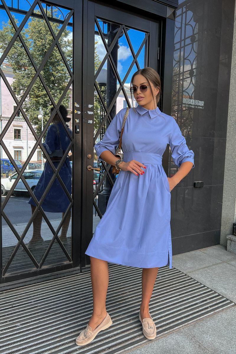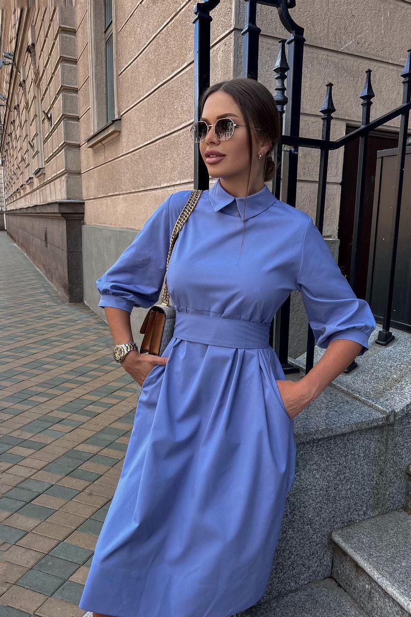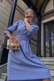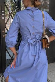Комфорт, удобство, стильный фасон, гармоничная длина и ничего лишнего! Это абсолютно беспроигрышный вариант на каждый день! Базовое платье полуприталенного силуэта. Платье отрезное по линии под грудью с бантовыми складками по шву притачивания, с центральной застежкой по спинке на петли и пуговицы. В боковых швах удобные карманы. Платье с отложным воротником-стойкой. Втачные рукава 3/4 оканчиваются притачной манжетой.
