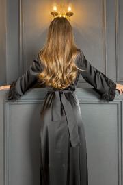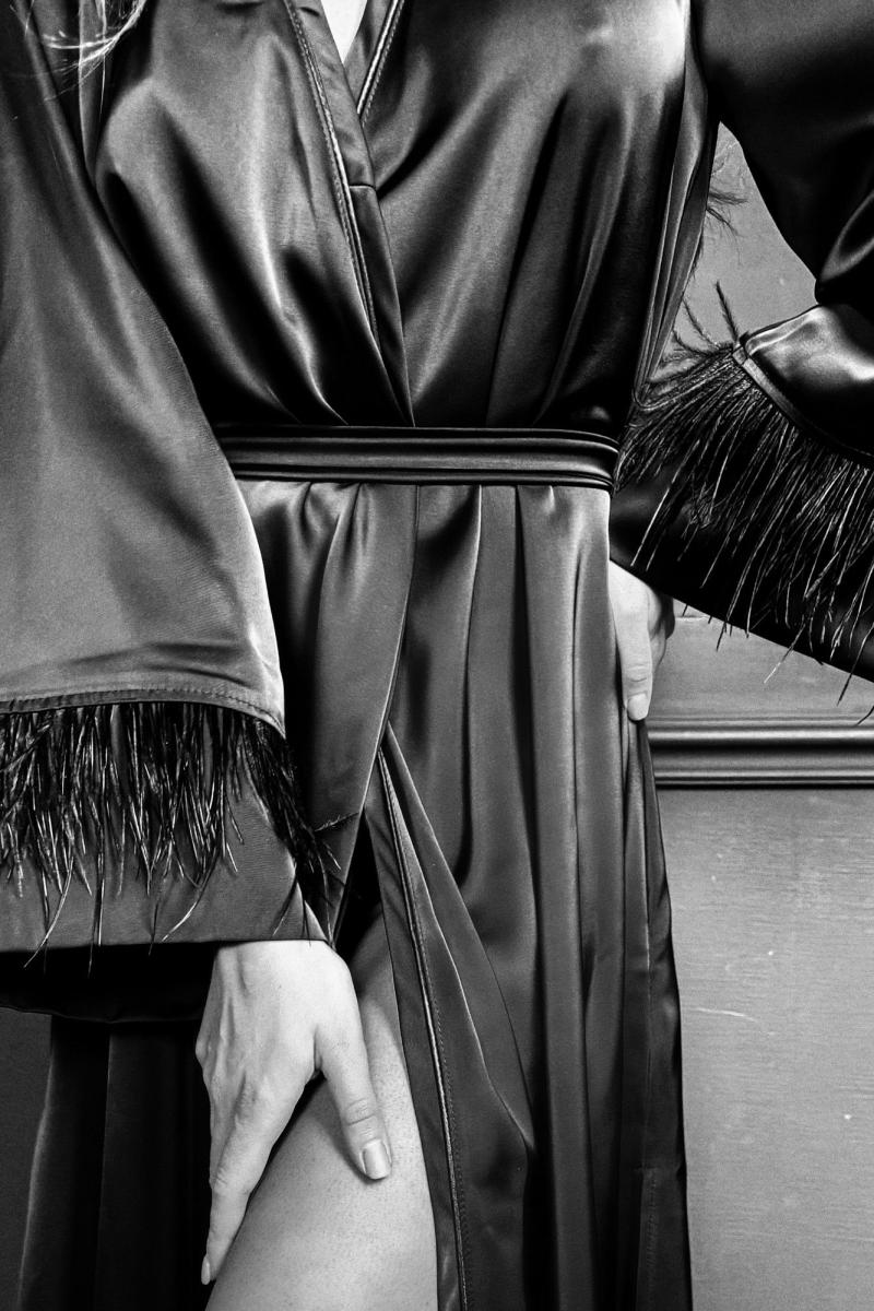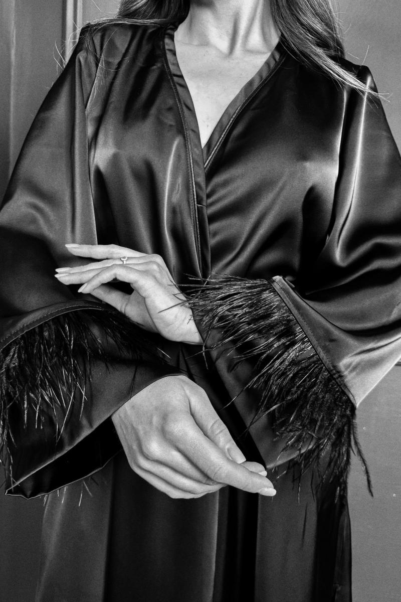 Эффектное платье-кимоно в пол с разрезами по бокам. Это платье для самого шикарного вашего выхода! Исключительный двухсторонний атлас + натуральные перья страуса. Длина платья по спинке 141 см.