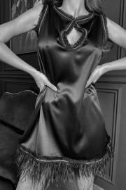 Маленькое черное платье трапециевидной формы. По горловине и пройме идёт отделка декоративной лентой. По низу платья-отделка тесьмой со страусиными перьями. Длина по спинке 79 см. Полуобхват по груди в размере 42 - 46 см В размере 44 - 50 см В размер 46 - 54 см В размере 48 - 60 см.