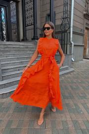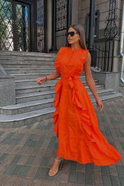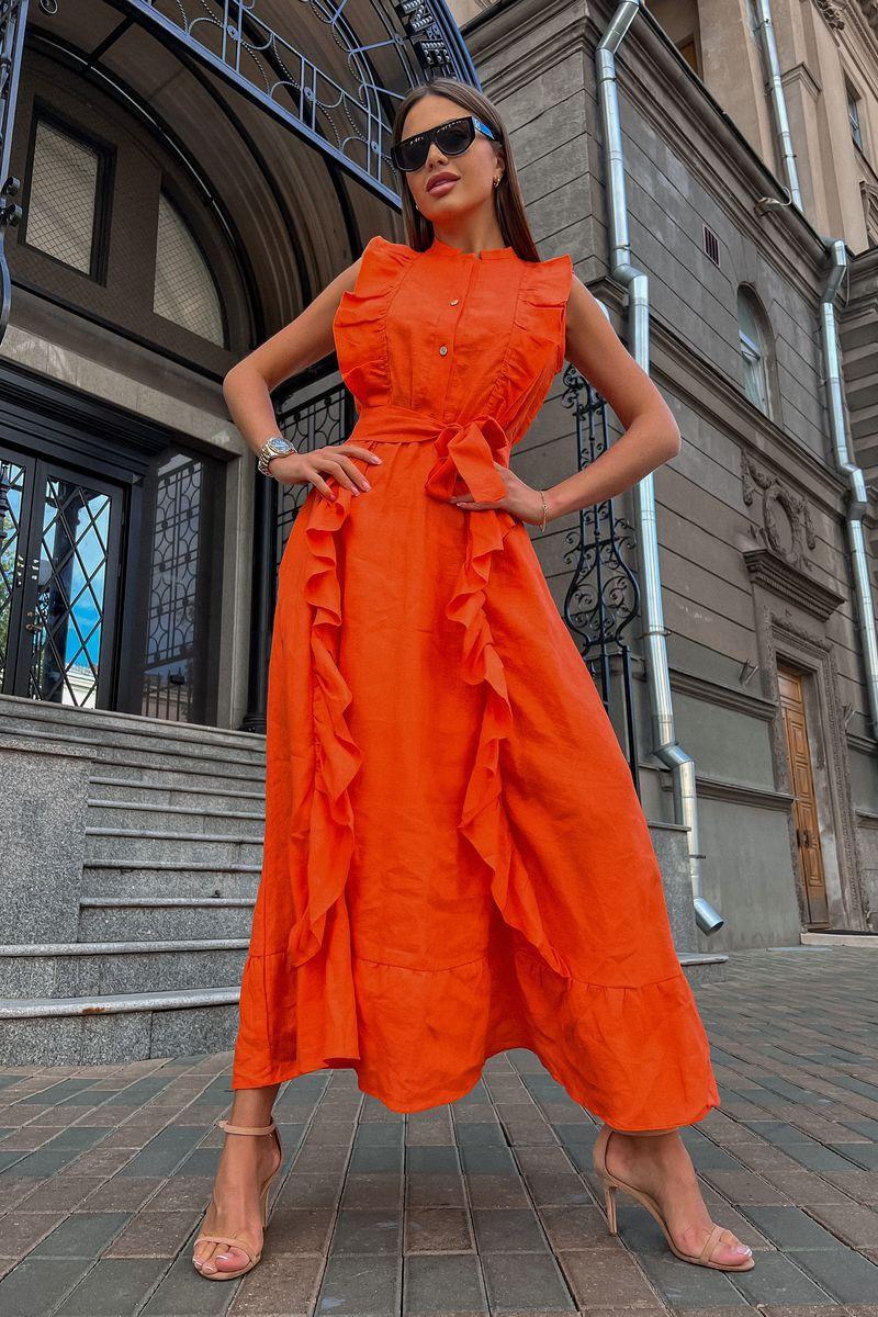 Льняное платье с воланами: самая романтичная Модель лета! Стильное, невероятно эффектное платье. Застегивается на пуговицы. Воздушность и легкость платью придают вертикальные воланы, что, к тому же, вытягивает силуэт. Низ платья, так же, декорирован воланом, придающим романтичности и особого шика. Элегантное, женственное, мгновенно приковывает взгляд к обладательнице – такое платье подойдет как для романтических прогулок, встреч с друзьями, так и для особых событий в вашей жизни, даря прекрасное настроение и возможность выглядеть на все 100%. Пояс в комплект с платьем