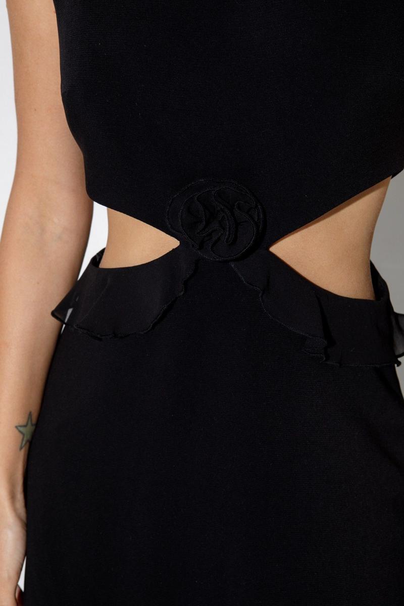 Мини-платье с вырезами по бокам и декором-розой. Детали: полуприлегающий силуэт, завышенная линия талии, нагрудные и талиевые вытачки, застежка на потайную молнию по спинке, платье на хлопковой подкладке. Длина по спинке около 87 см в размерах 40-46 и около 90 см в размерах 48-52