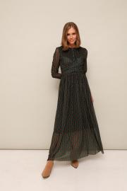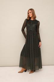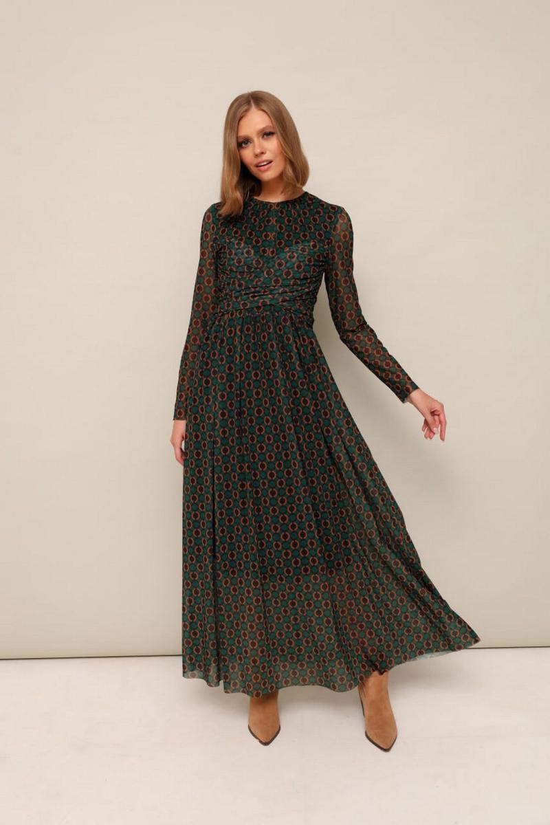 Эффектное платье в длине макси, отрезное по линии талии, выполнено из сетки с дизайном. Округлая форма горловины со сборкой и вырезом в среднем шве. Лиф с фигурным подрезом в области груди и перекрестными драпированными деталями, переходящими на спинку. Рукава длинные втачные. Юбка А –образного силуэта. Застежка по спинке на потайную тесьму-молнию. Платье обработано эластичной подкладкой из масла.