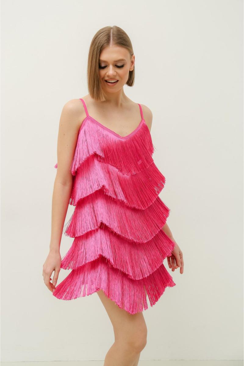 Эффектное платье прямого силуэта. Горловина переда V-образной формы. Платье декорировано настрочной тесьмой с бахромой. Бретели регулируются по длине.