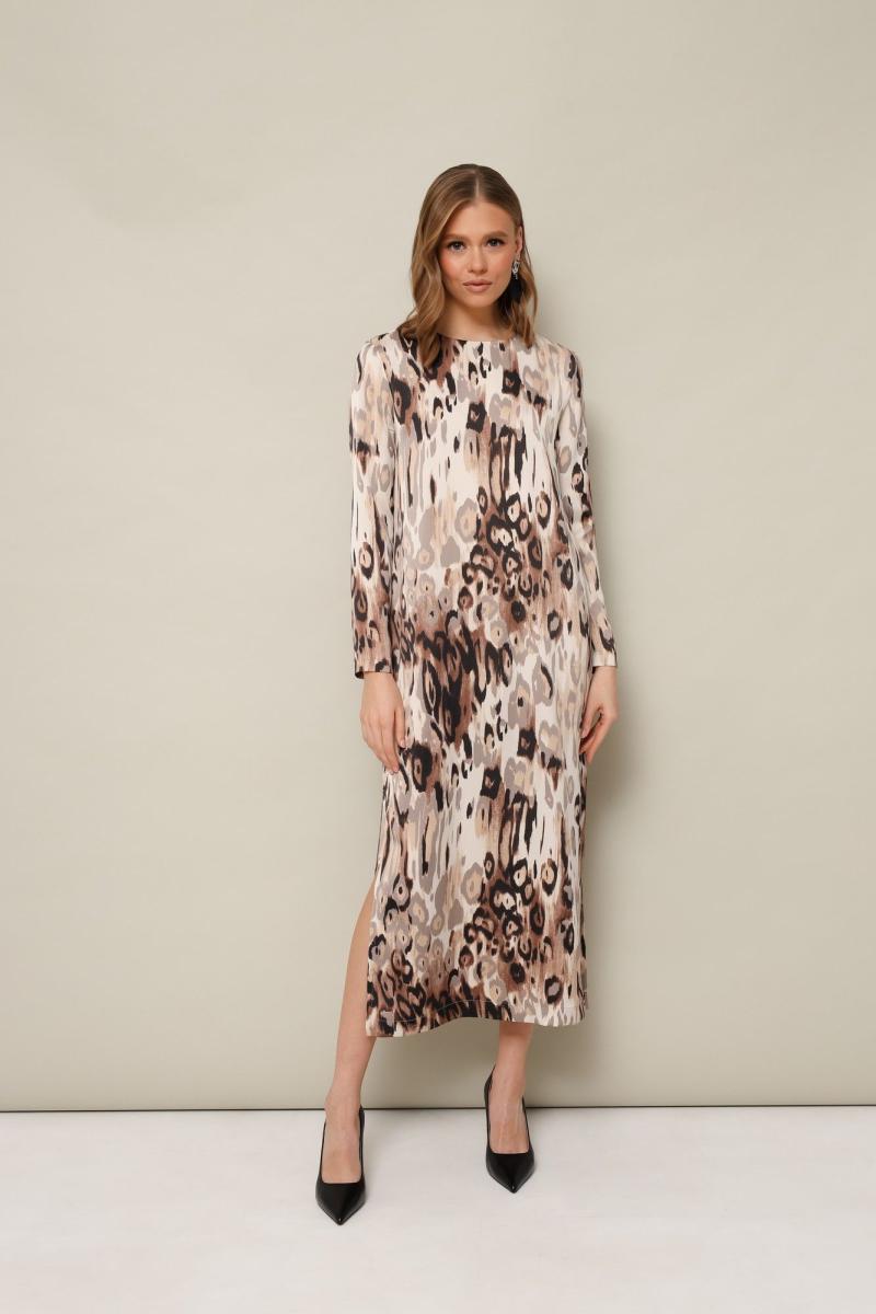 Платье прямого силуэта в длине миди, выполнено из струящейся ткани с благородным матовым блеском и актуальным абстрактным дизайном. Округлый вырез горловины. Рукава длинные втачные. Застежка по спинке в среднем шве «капля» на пуговицу и навесную петлю. По низу в боковых швах обработаны высокие разрезы.