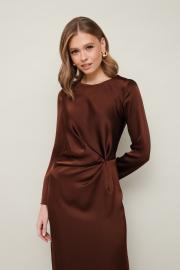 Вечернее платье полуприлегающего силуэта, выполнено из струящейся ткани с благородным матовым блеском. Горловина округлой формы. В области талии заложены складки, плавно переходящие в драпировку. Рукава втачные длинные. Застежка в среднем шве спинки на тесьму молнию. Для удобства движения сзади обработан разрез.