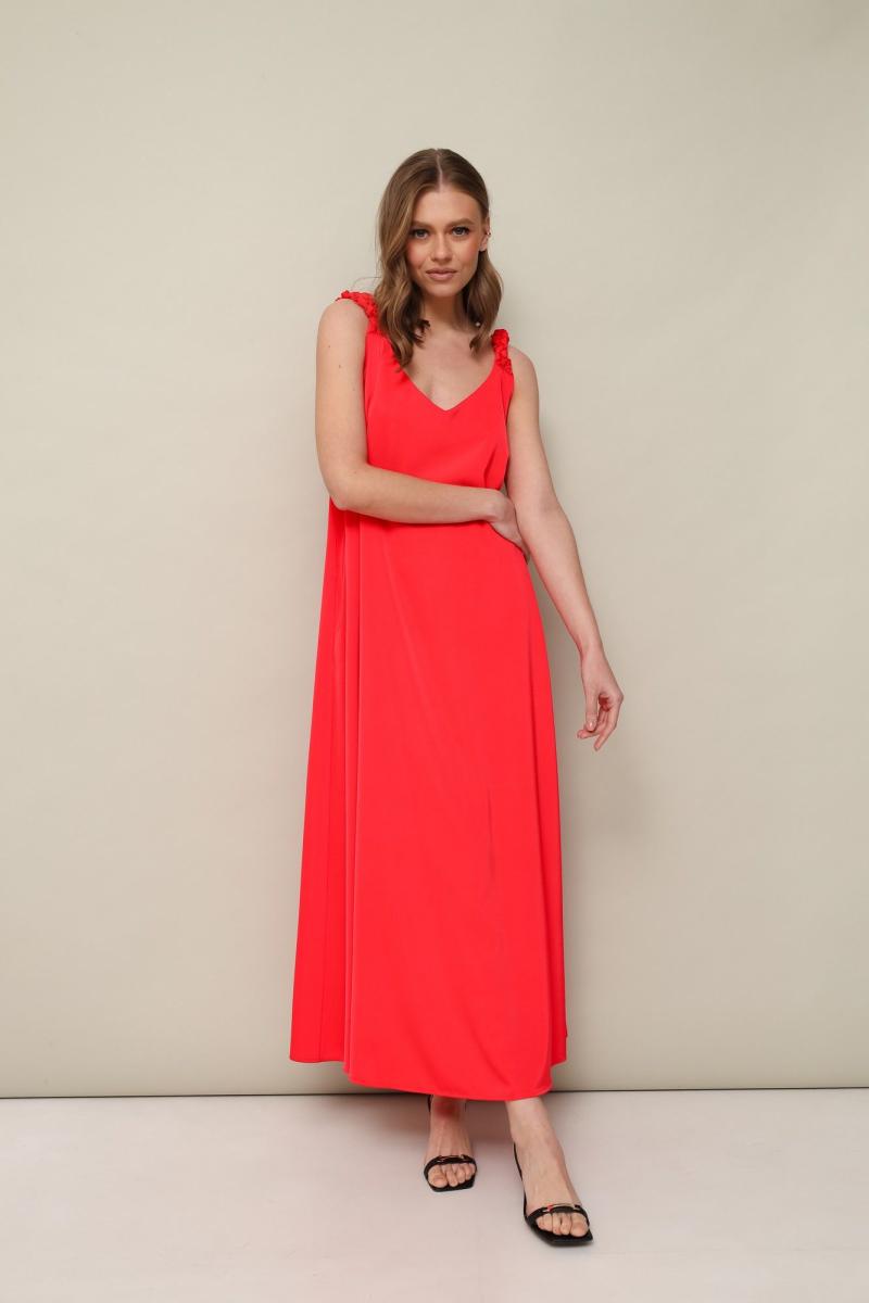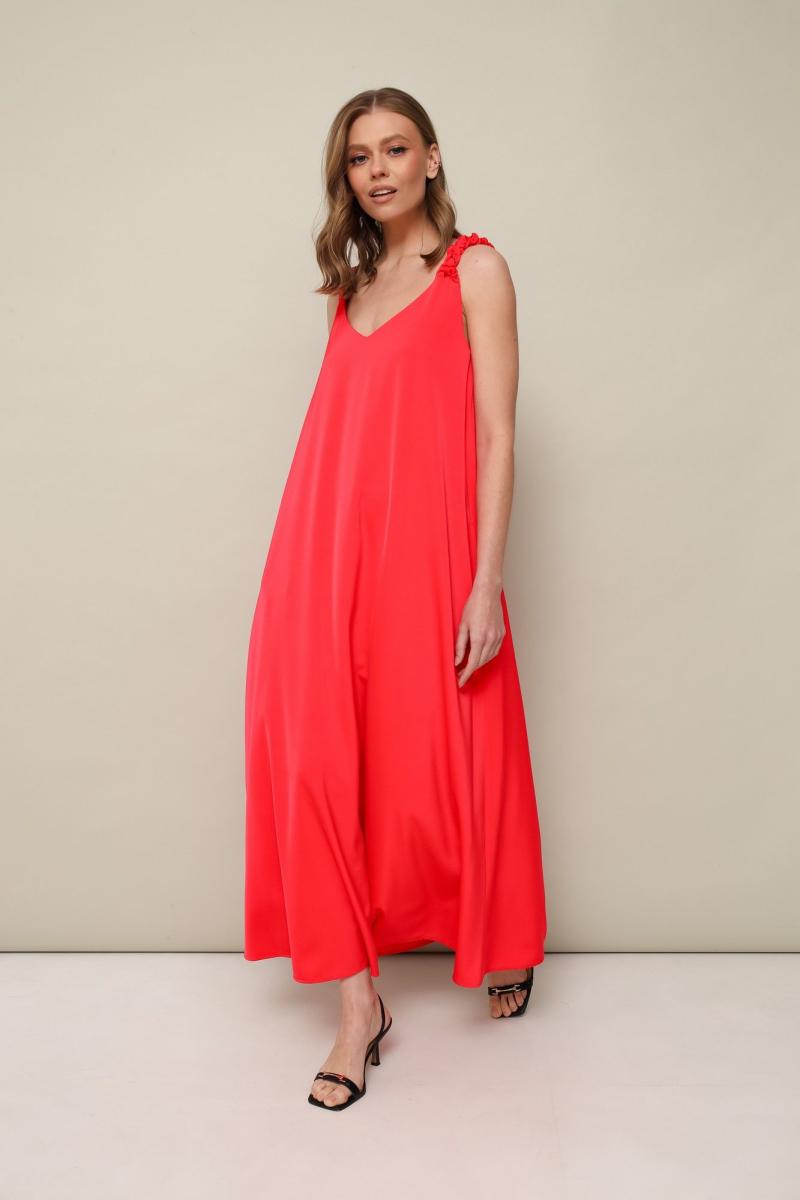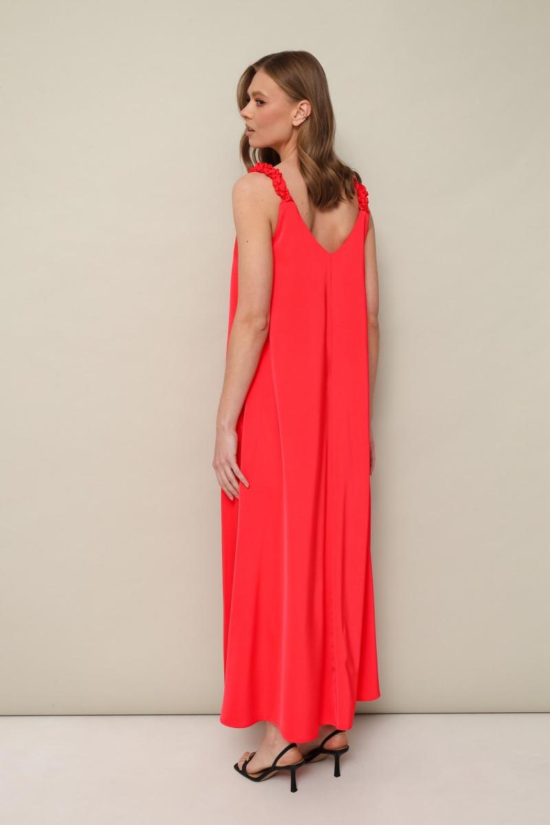 Лаконичное платье А-образного силуэта, выполнено из струящейся ткани с благородным матовым блеском. V-образный вырез горловины переда и спинки. Стильным акцентом служат переплетенные бретели из основной ткани. В боковых швах обработаны карманы. Спинка со средним швом. Изделие без подкладки.