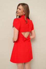 Платье в длине мини, отрезное по линии талии, выполнено из плательной ткани. Горловина с отрезной стойкой. Лиф переда с рельефами. Присборенные рукава-тюльпаны с контрастной отделочной тканью. Юбка А-образного силуэта. В среднем шве спинки застежка по лифу- навесные петли и обтяжные пуговицы, по юбке- потайная молния. Спинка с фигурным вырезом выше линии талии и с декоративным бантом. Платье на х/б подкладке.