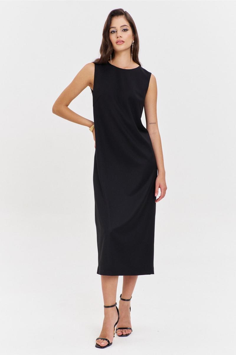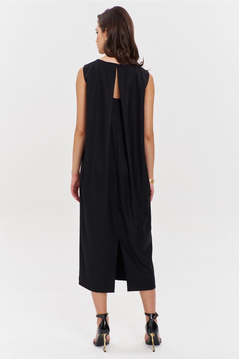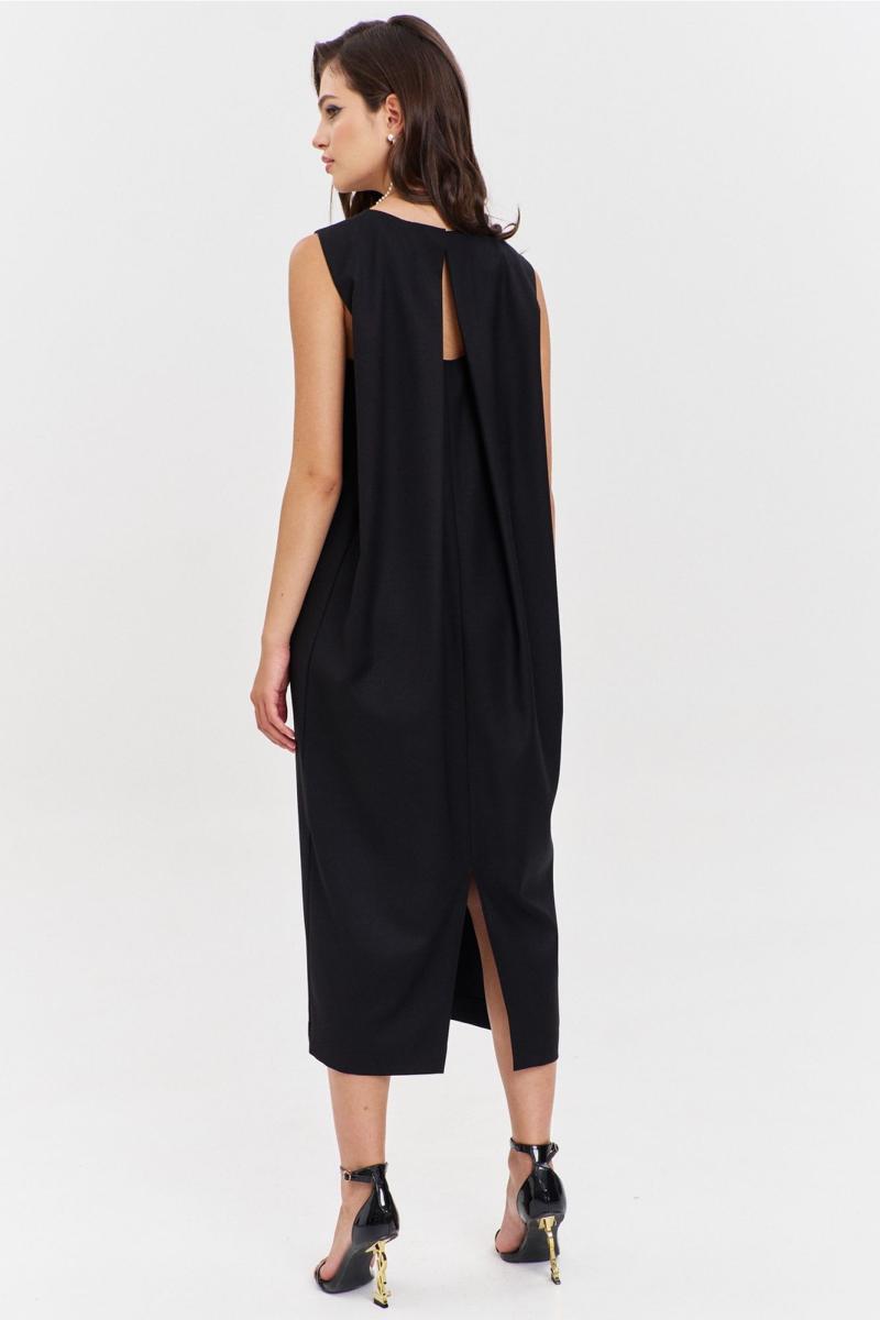 Платье свободного кроя, длиной до середины икры. Платье по спинке со средним швом, в котором обработан разрез. По центру спинки заложены встречные мягкие складки; по боковым, от плеча спинки заложены односторонние складки. Перед с нагрудными вытачками. Горловина округлой формы, с застежкой по спинке на кнопку.