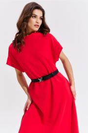 Платье свободного кроя, расширенное к низу, длиной до щиколотки, с неровной линией низа (по переду укороченное). Рукава цельнокроеные, короткие с притачной манжетой. В боковых швах обработаны карманы. Горловина округлой формы со стойкой.