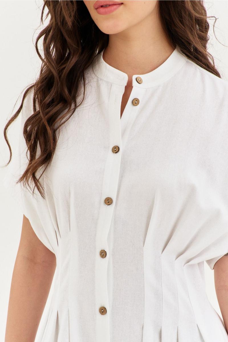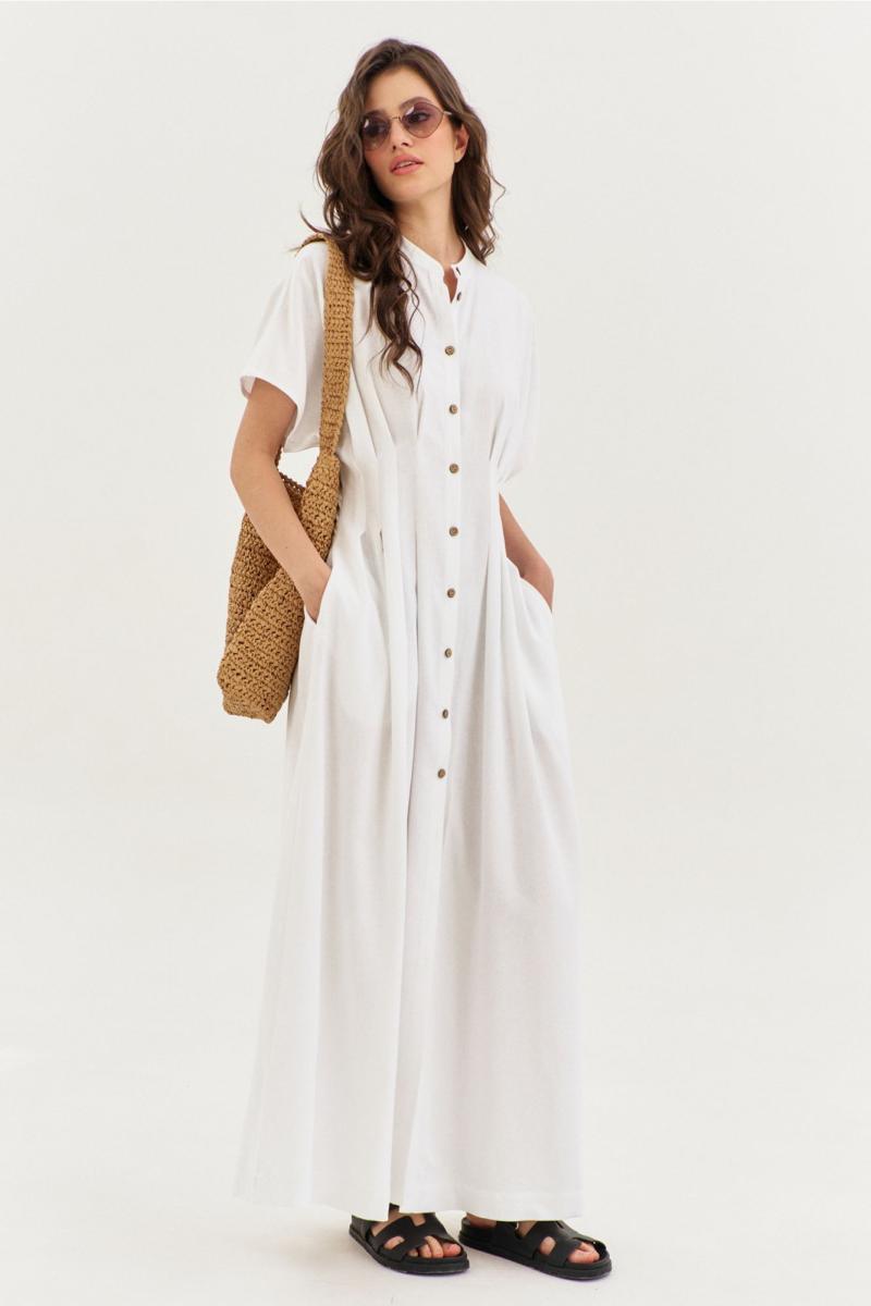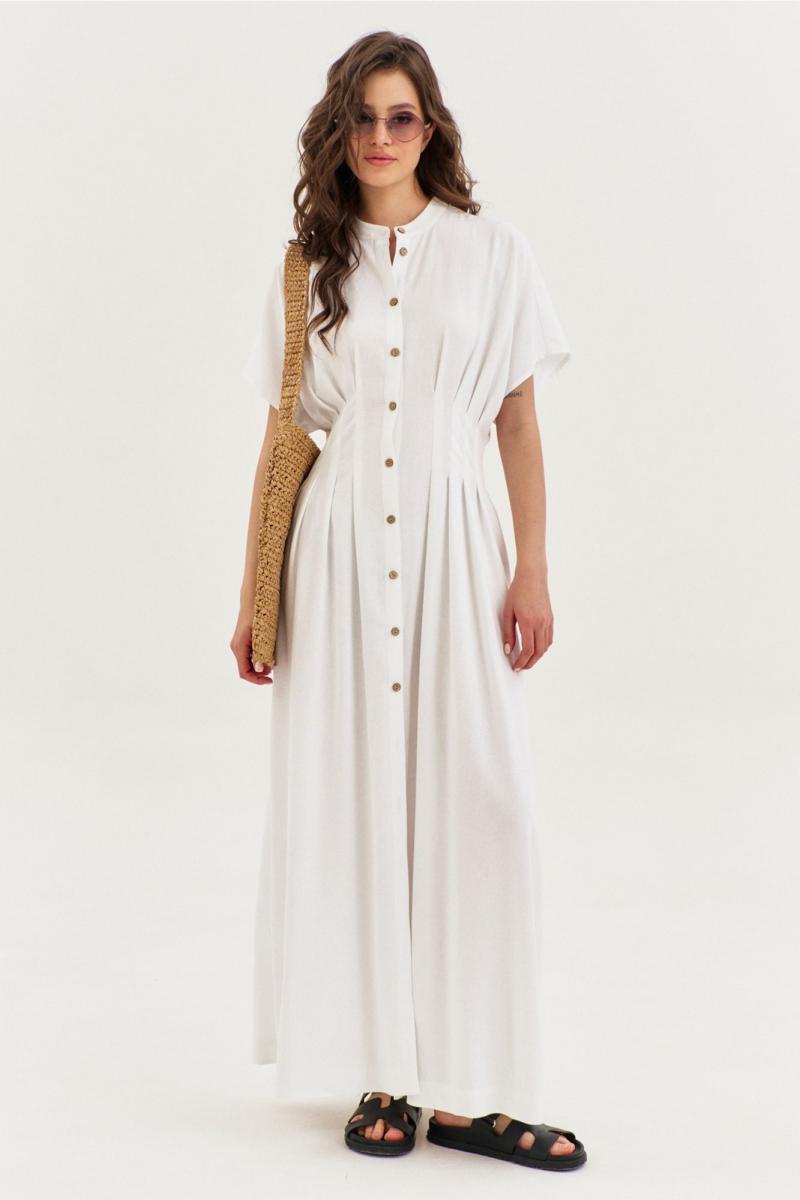 Платье полуприлегающего силуэта, расширенное к низу, длиной макси, с цельнокроеными рукавами. По талии застрочены складки. В боковых швах обработаны карманы. По переду застежка на петли и пуговицы. По горловине воротник-стойка.