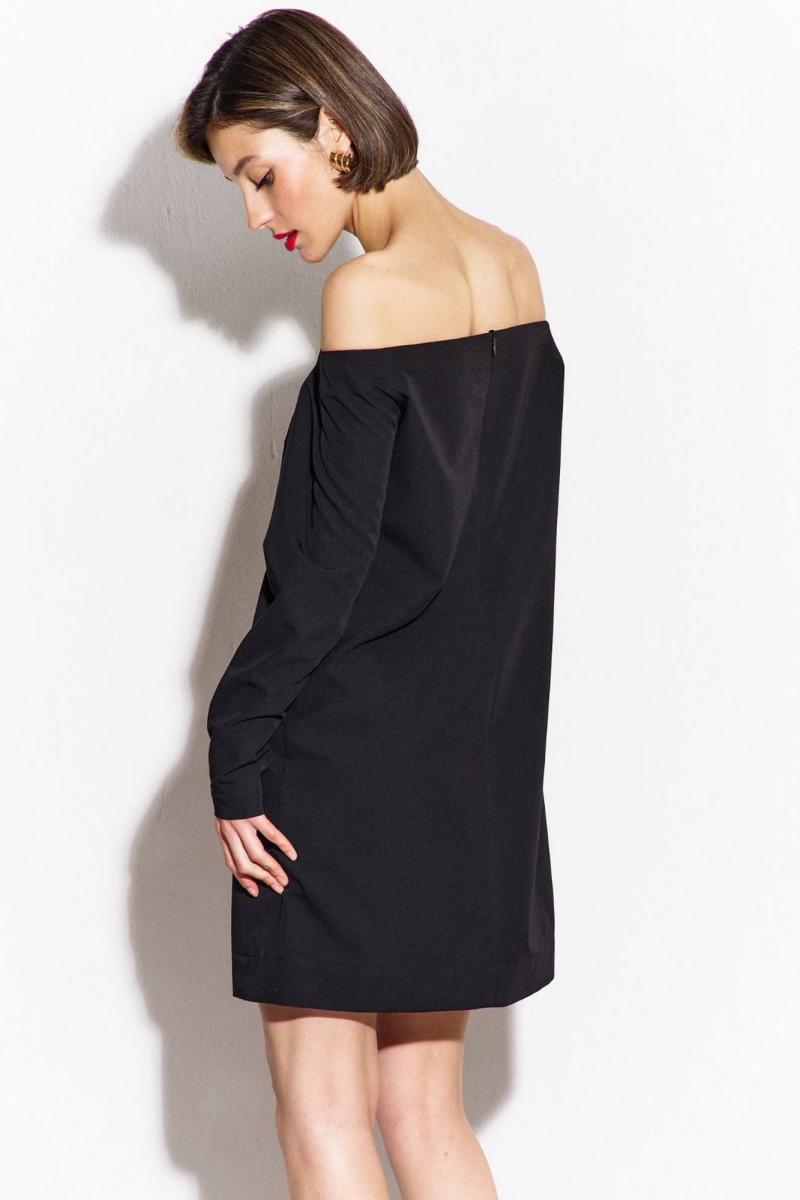 Платье свободного кроя: -длина до середины бедра -спинка с застежкой на потайной тесьме-«молнии» -платье с открытой линией плеча -рукава втачные, одношовные, длинные.