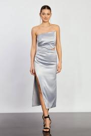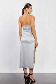 Платье: - прилегающий силуэт - отрезное по талии - ассиметричный вырез на боку слева - верх на корсетных косточках с ассиметричной линией верха и драпировкой справа - низ с высоким вырезом и драпировкой - застёжка на потайную молнию в среднем шве спинки