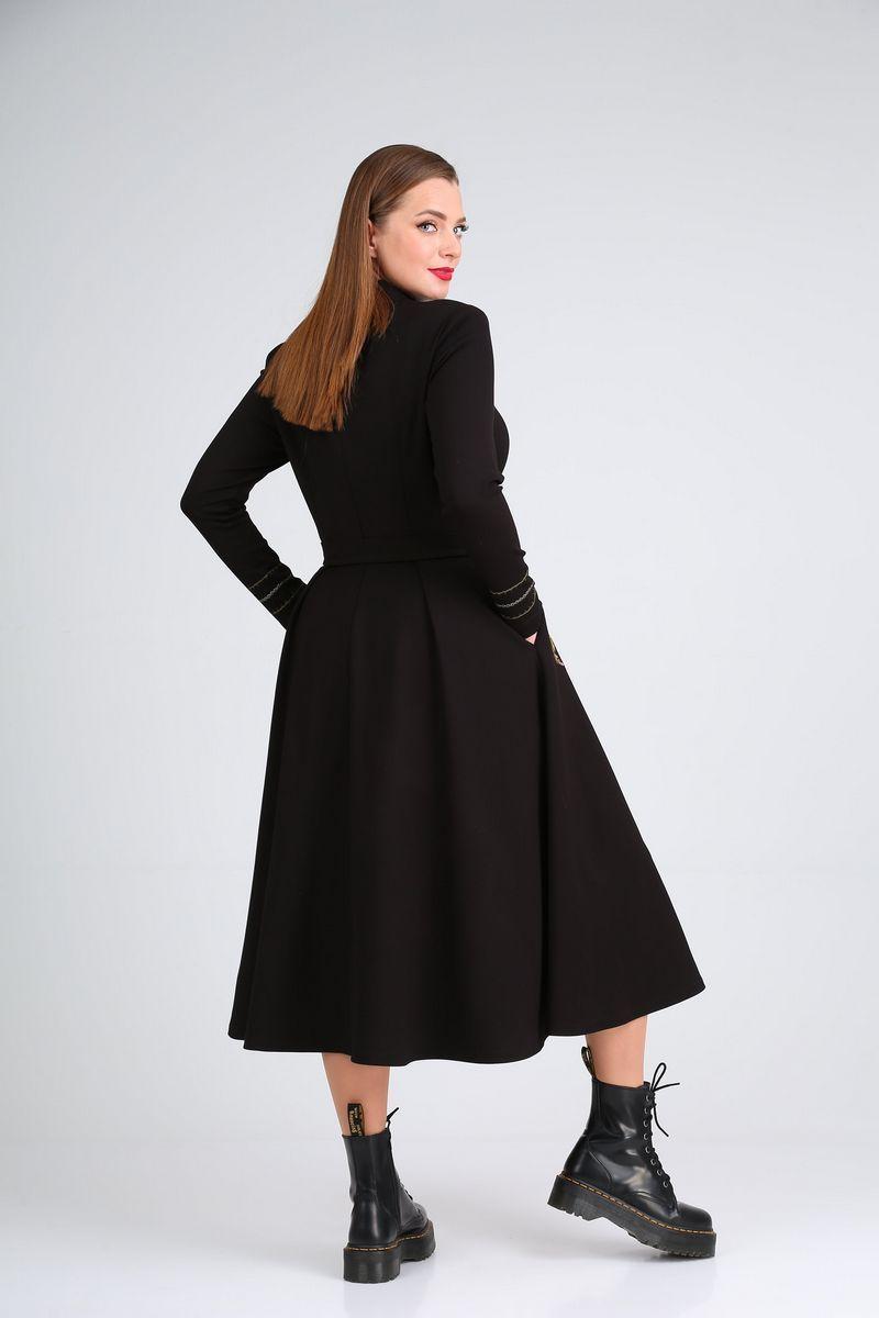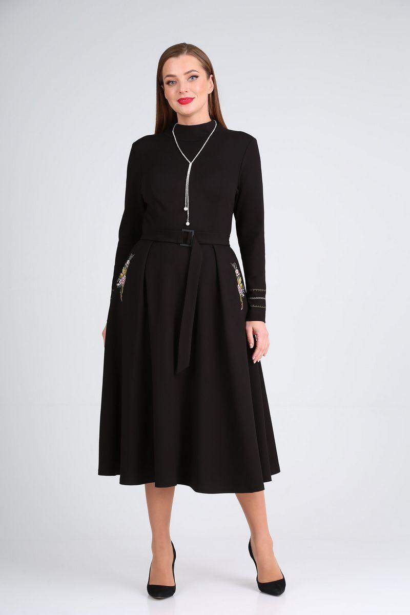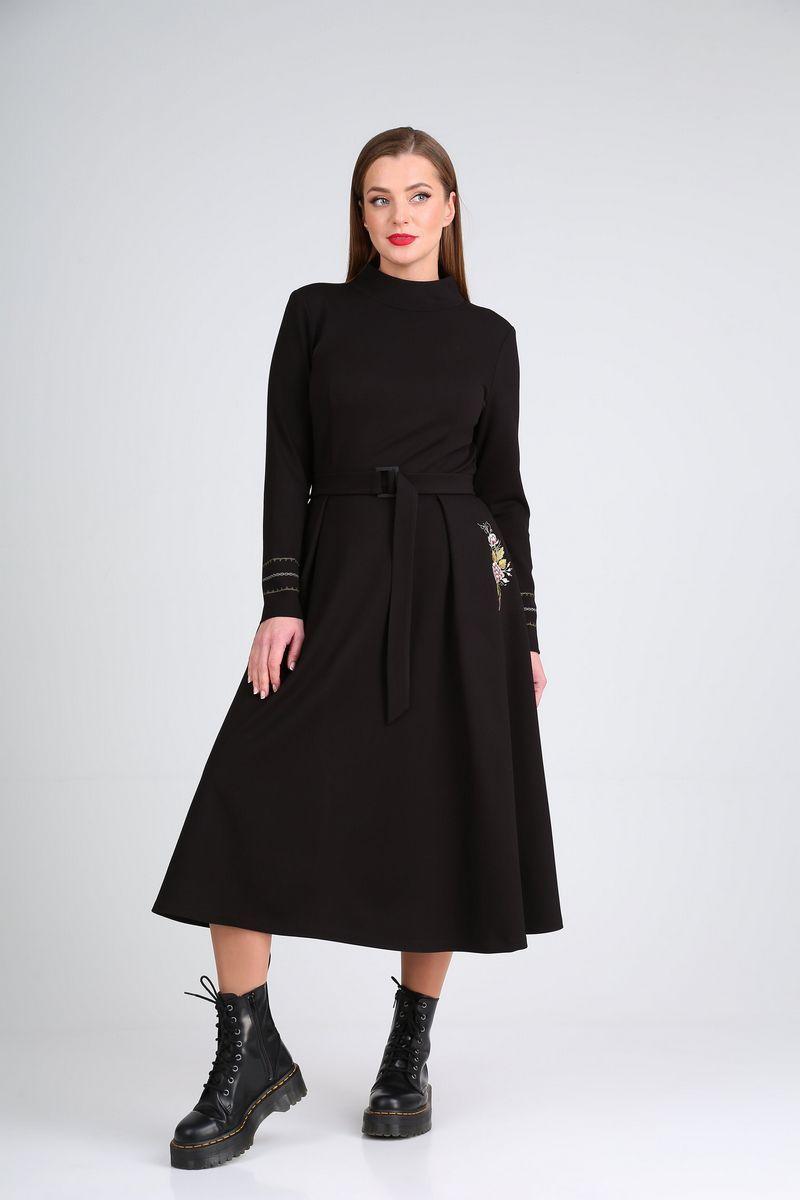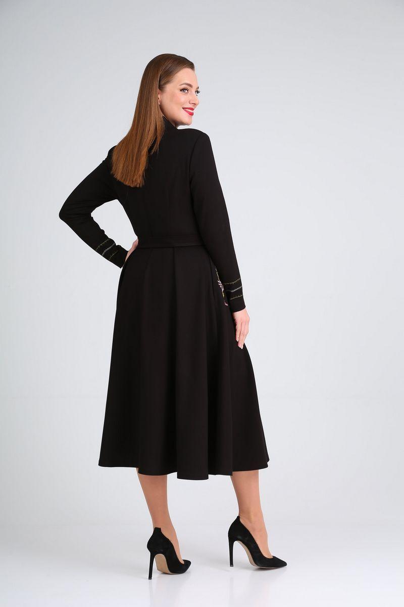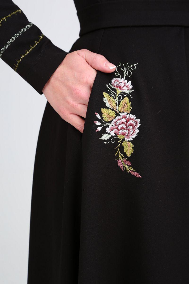 Платье трикотажное, отрезное по линии талии, прилегающее в верхней части, А-образное в нижней. Перед с талиевыми вытачками, горловиной-стойкой и односторонними складками в нижней части. В боковых швах – карманы. Вдоль карманов расположена вышивка. Спинка со средним швом, талиевыми вытачками и односторонними складками в нижней части. Рукав втачной одношовный с вышивкой по низу. К изделию прилагается съёмный пояс из основной ткани с металлической пряжкой и съёмная брошь. Длина платья: 118см. Длина рукава: 62см.