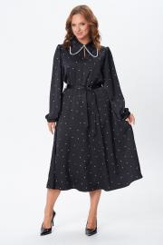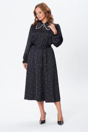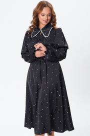 Платье из плотного атласа отрезное и собранное на резинку по линии талии, с расширенной к низу юбкой. Лиф платья свободный. Рукав втачной одношовный на притачной манжете с резинкой. Вырез горловины круглый. Воротник отложной, на стойке с застежкой на петлю и пуговицу. Край воротника отделан кружевом.