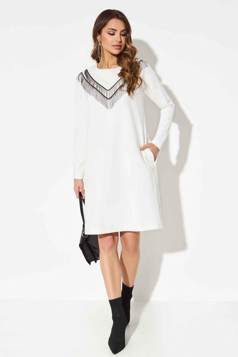 Платье из плотного трикотажа с декоративной бахромой. Прямой силуэт, карманы в боковых швах, круглый вырез горловины. Рукав длинный покроя реглан. Застежка на одну пуговицу по спинке, без подкладки. Длина платья 96 Длина рукава 71