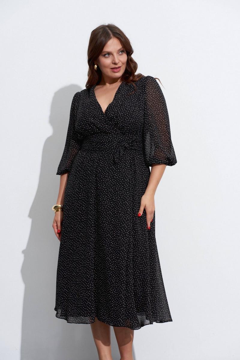 Платье из шифона с отрезным лифом и разведённым низом. Лиф переда выполнен запашным из присборенных у плеча и в талии деталей. Нижние детали платья также с запахом. Платье можно подвязывать поясом. Рукава в ¾ длины, сверху присборены и снизу собраны на эластичную тесьму. Изделие на лёгкой подкладке. Длина по спинке ок. 124 см. в 52м.