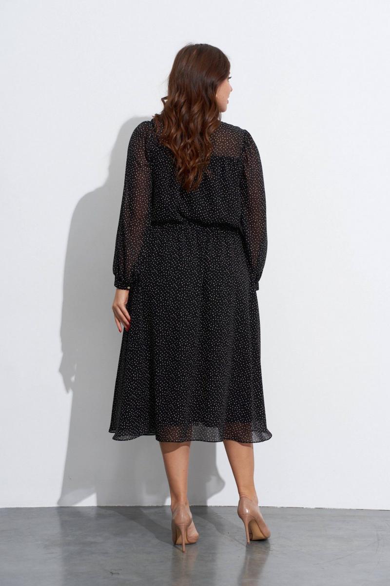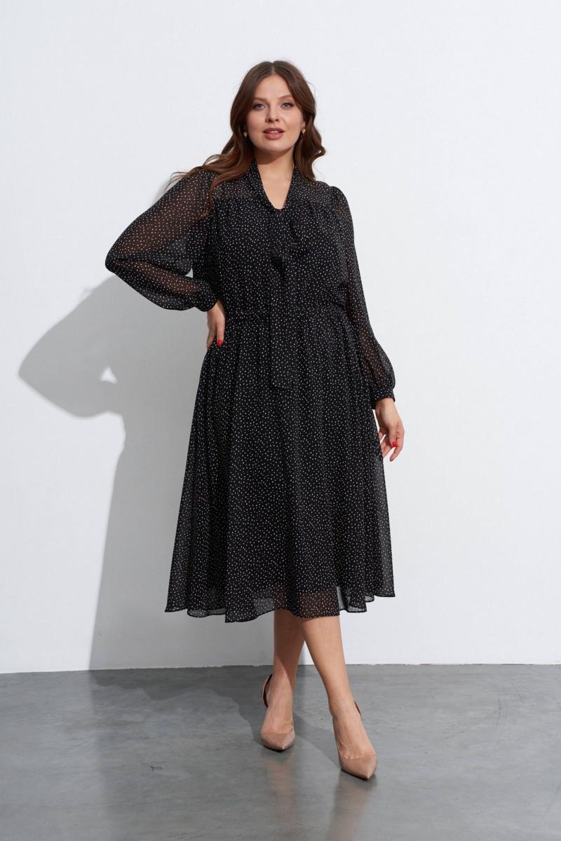 Платье из шифона с отрезным лифом и разведённым низом. Лиф переда выполнен запашным из присборенных у плеча и в талии деталей. Нижние детали платья также с запахом. Платье можно подвязывать поясом. Рукава в ¾ длины, сверху присборены и снизу собраны на эластичную тесьму. Изделие на лёгкой подкладке. Длина по спинке ок. 124 см. в 52м.