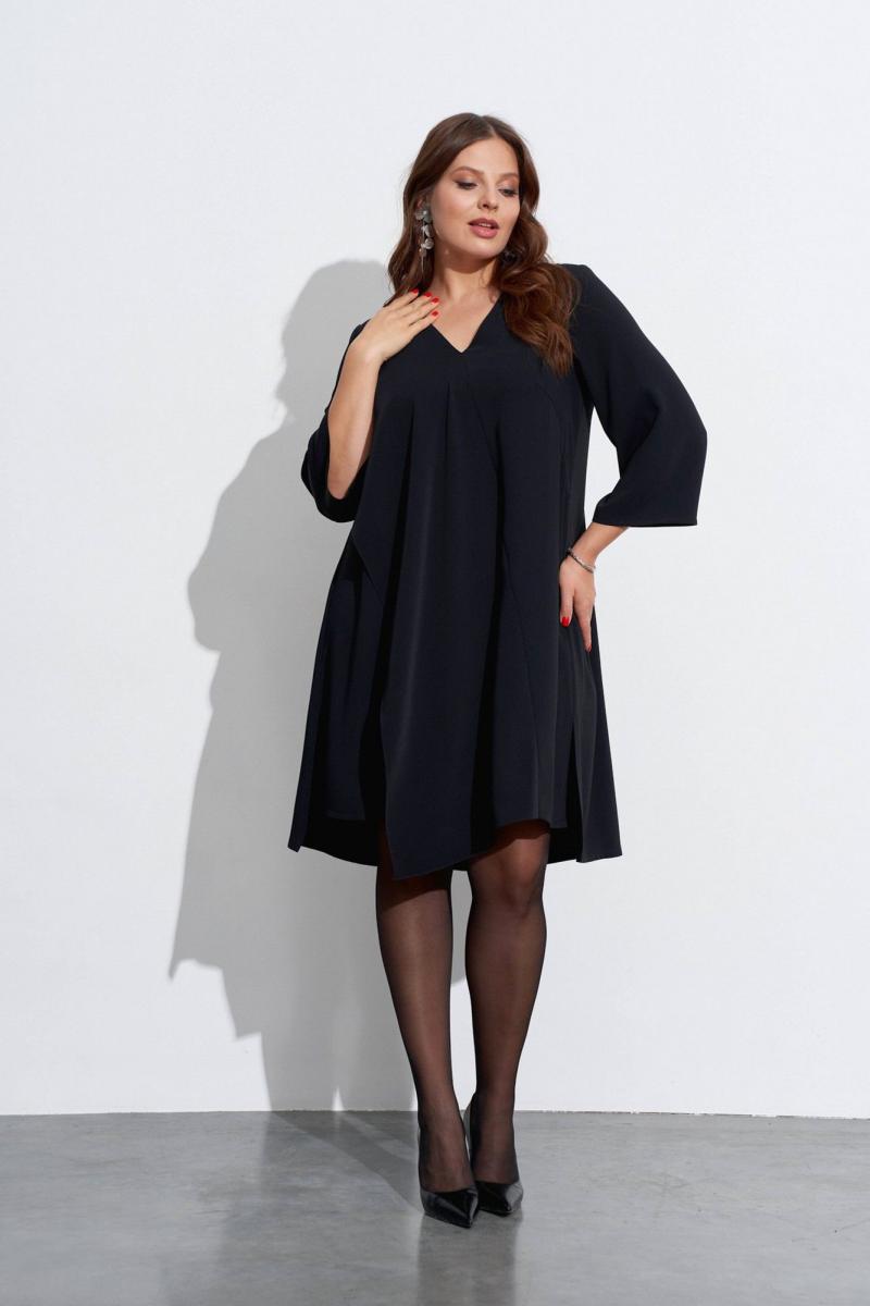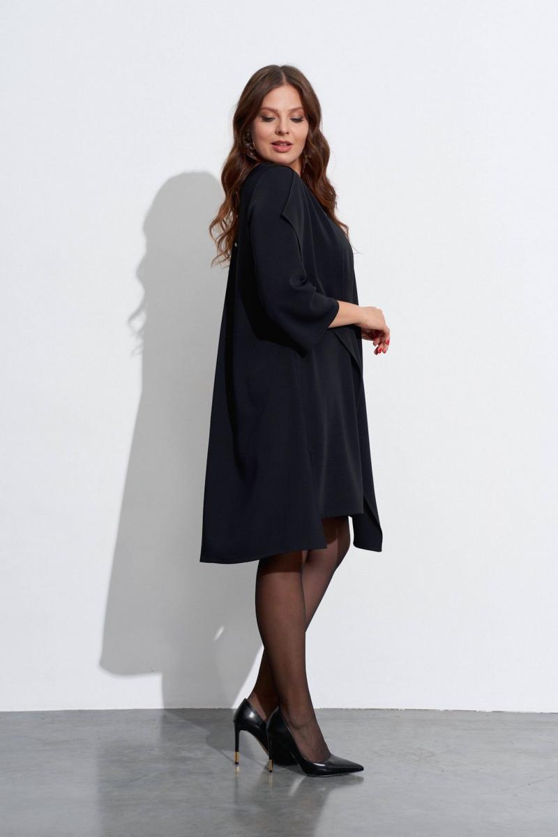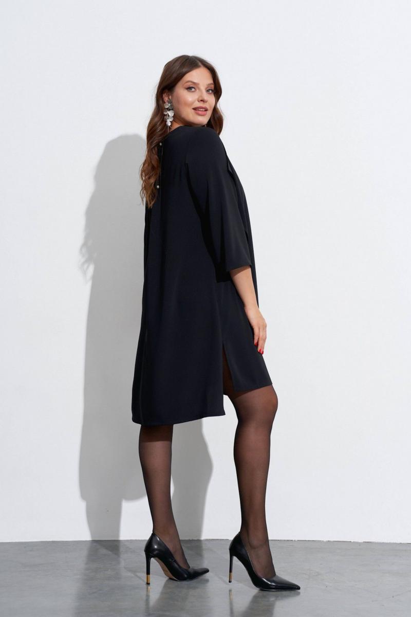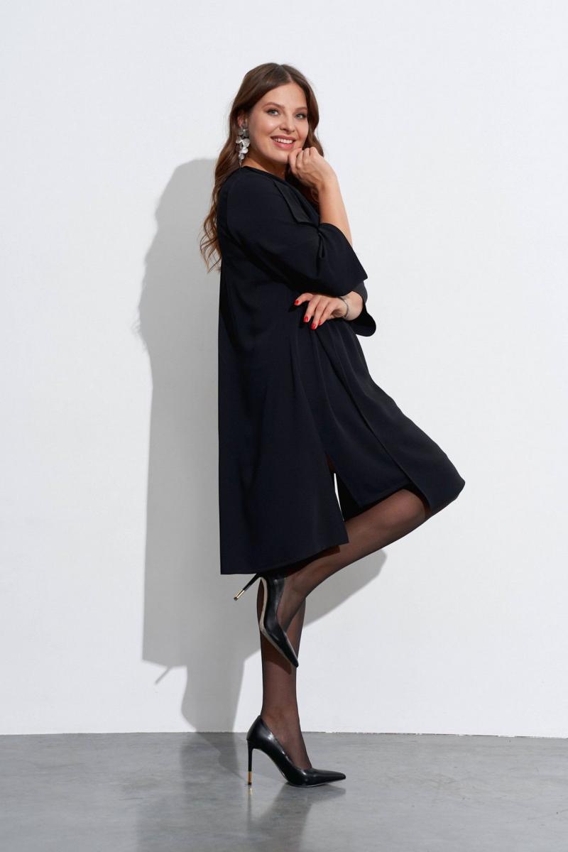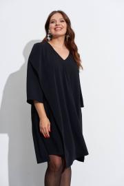Свободное платье с небольшим расширением к низу. Горловина с V-образным вырезом. Рукава широкие, в ¾ длины. Деталь переда с нагрудными вытачками ,с косым швом от горловины до низа и с отлетной деталью. В боковых швах разрезы, у горловины спинки закреплены две складки, декорированные пришивной фурнитурой. Длина спинки ок. 103 см. в 52 м.