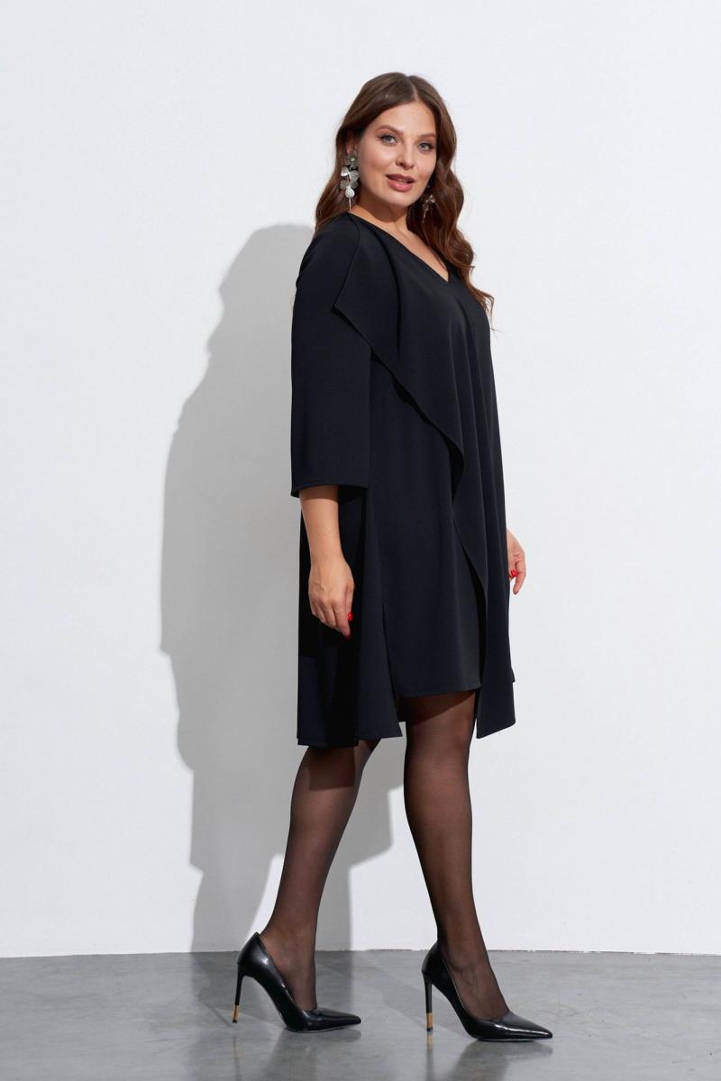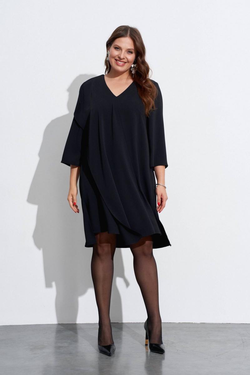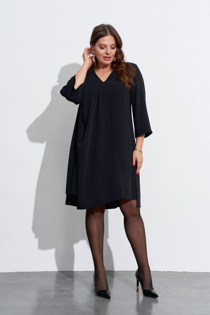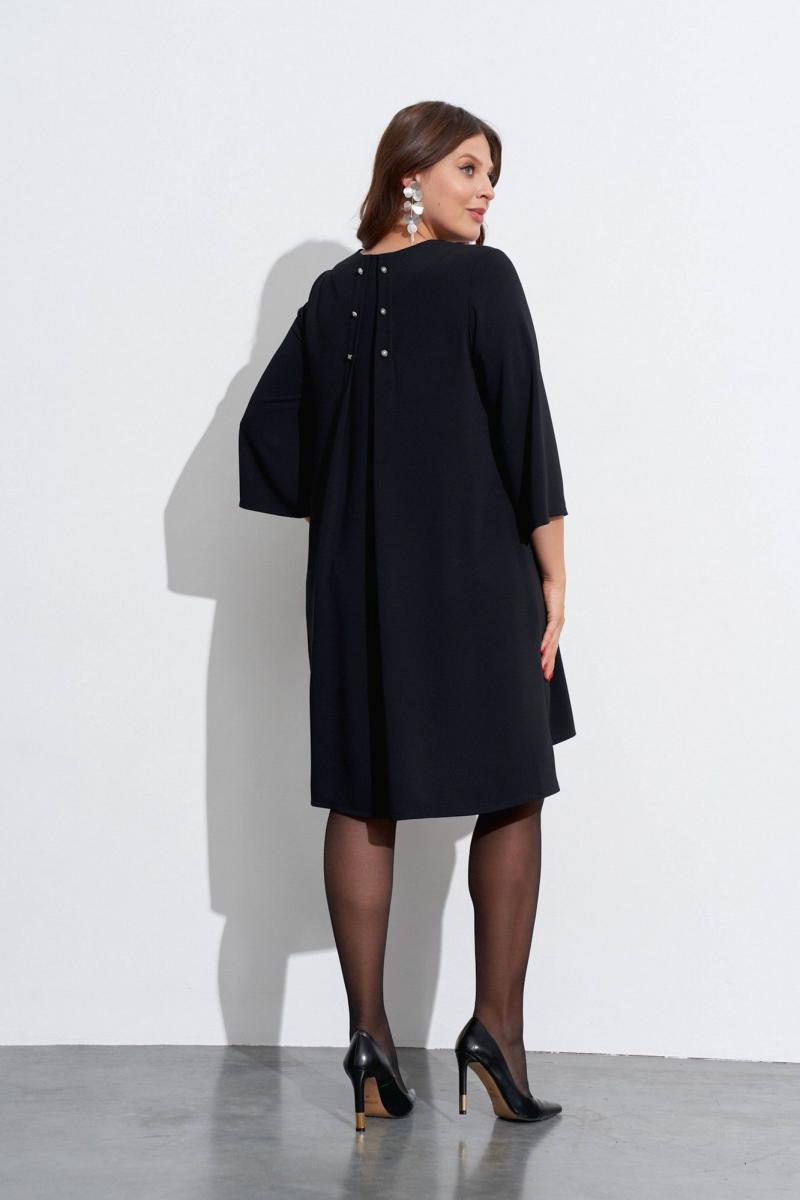 Свободное платье с небольшим расширением к низу. Горловина с V-образным вырезом. Рукава широкие, в ¾ длины. Деталь переда с нагрудными вытачками ,с косым швом от горловины до низа и с отлетной деталью. В боковых швах разрезы, у горловины спинки закреплены две складки, декорированные пришивной фурнитурой. Длина спинки ок. 103 см. в 52 м.