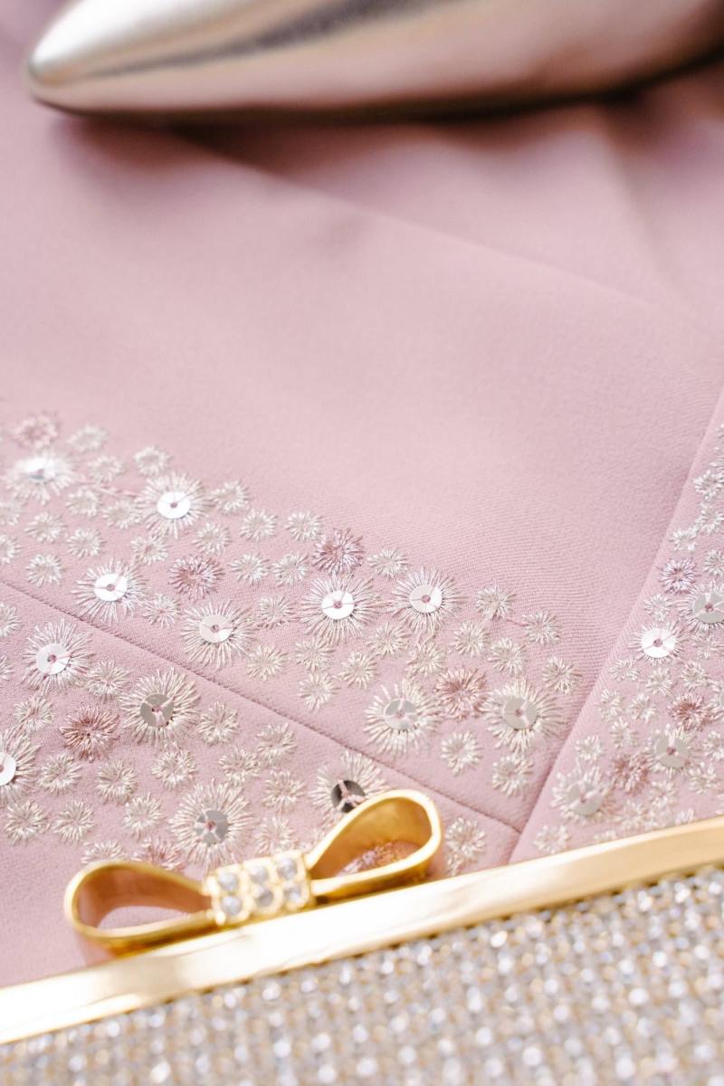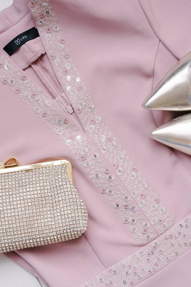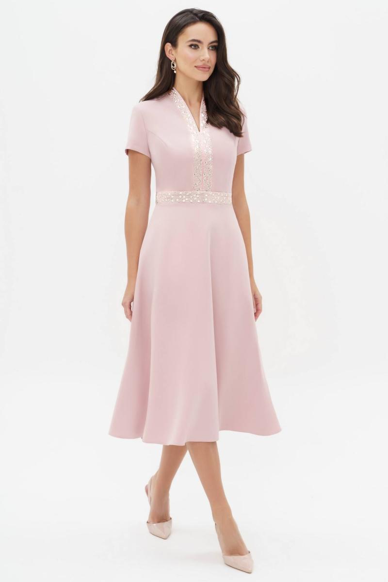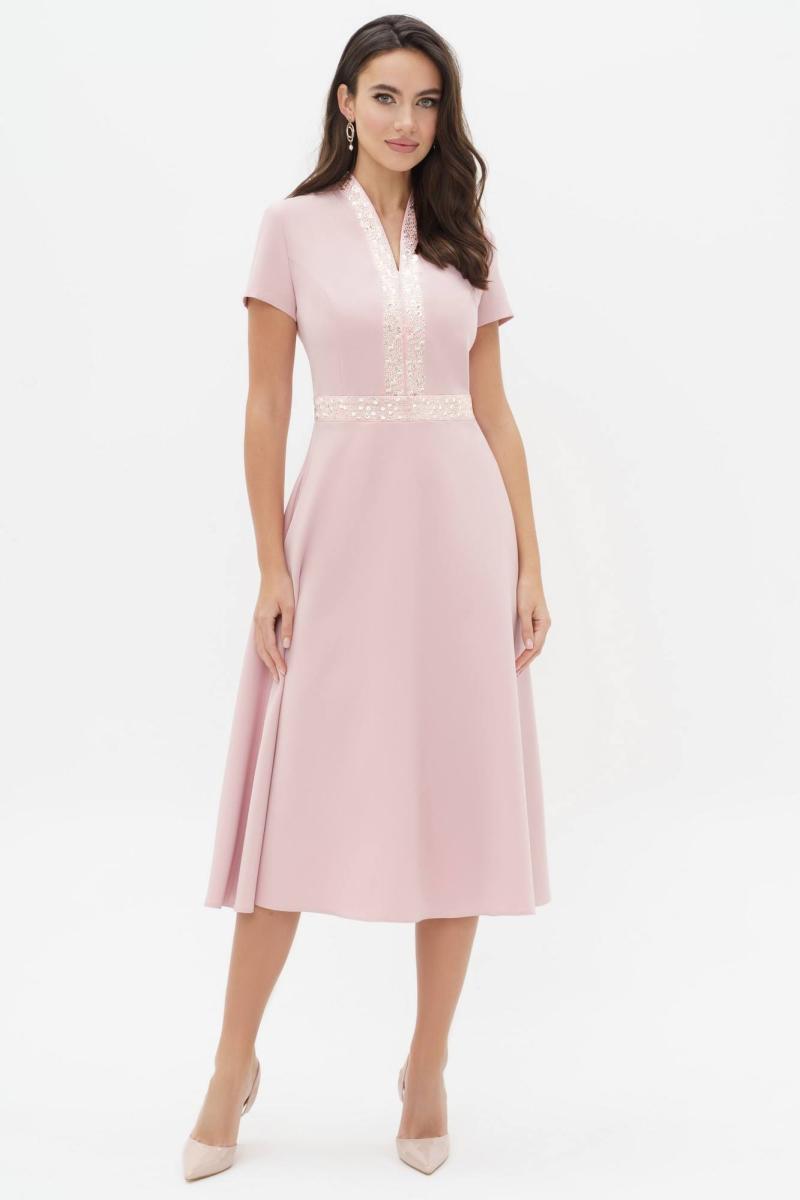 Летнее платья с дизайнерской вышивкой – это всегда восхитительные и женственные образы, позволяющие выглядеть роскошно и привлекательно. Платье женское из костюмно-плательной ткани, силуэта песочные часы, отрезное по линии талии с притачным поясом, длиной миди, с декоративной вышивкой. Верхняя часть переда (лиф) с рельефными швами, идущими от притачного пояса до проймы и швом посередине переда. Спинка (лиф) со средним швом, в котором обработана застежка на потайную тесьму-молнию и с рельефными швами от проймы до шва притачивания пояса. Нижняя часть платья (юбка) расклешенная книзу. В боковых ниже талии расположены карманы в швах. Рукава втачные одношовные, короткие. Горловина V-образной формы обтачная, с цельнокроеным воротником стойкой. По притачному поясу переда и центральным деталям вдоль горловины расположена декоративная вышивка с пайетками. Длина платья по среднему шву спинки до низа - 119,0 см (±3,0 см), Длина рукава платья - 17,0 см (±1,0 см). Тип ткани: костюмно-плательная. Состав: полиэстер - 71%, вискоза - 23%, спандекс - 6%.