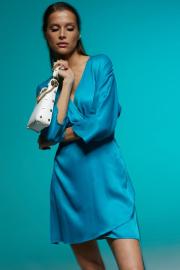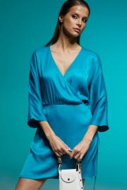 Платье мини полуприлегающего силуэта с запахом и цельнокроеным рукавом. Длина рукава ¾. Платье отрезное по тали. По юбке переда сборка и кулиса с завязками. В правом боковом застежка на молнию.