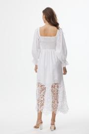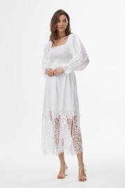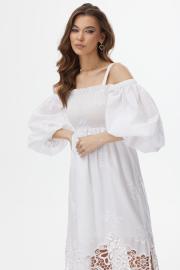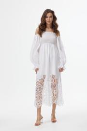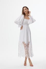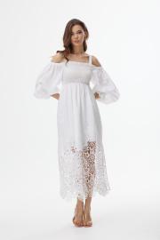 Платье из хлопковой ткани. Длина миди. Верх платья собран на венгерку. Рукава длинные объемной формы. По верху и низу рукава собраны на эластичную тесьму. Верх со съемными бретелями. Платье на подкладке.