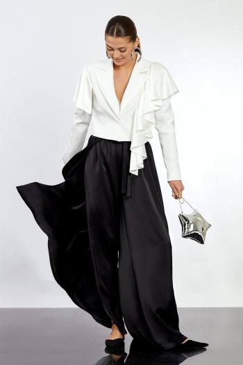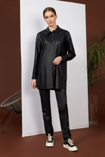Платье прилегающего силуэта из трикотажного полотна. Воротник стойка. Застежка в среднем шве спинки на потайную молнию. Слева разрез 29см. Рукав длинный с отверстием для большого пальца. По переду вырез асимметричной формы с открытым левым плечом.