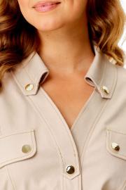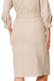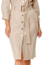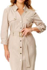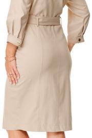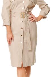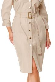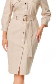 Платье женское полуприталенного силуэта зауженное книзу. Центральная бортовая застёжка с планкой на кнопки. Полочка и спинка с рельефами и отделочными строчками. Полочка с накладными клапанами с застёжкой на кнопки. Воротник на отрезной стойке блузочного типа. Отлет воротника обработан планкой с застёжкой на кнопки. Рукав втачной одношовный. Низ рукава с манжетой и складками. Манжета с застёжкой на кнопку. Имеется навесной пояс с отделочной пряжкой. Для поддержания пояса имеются шлёвки.