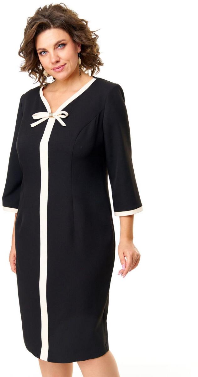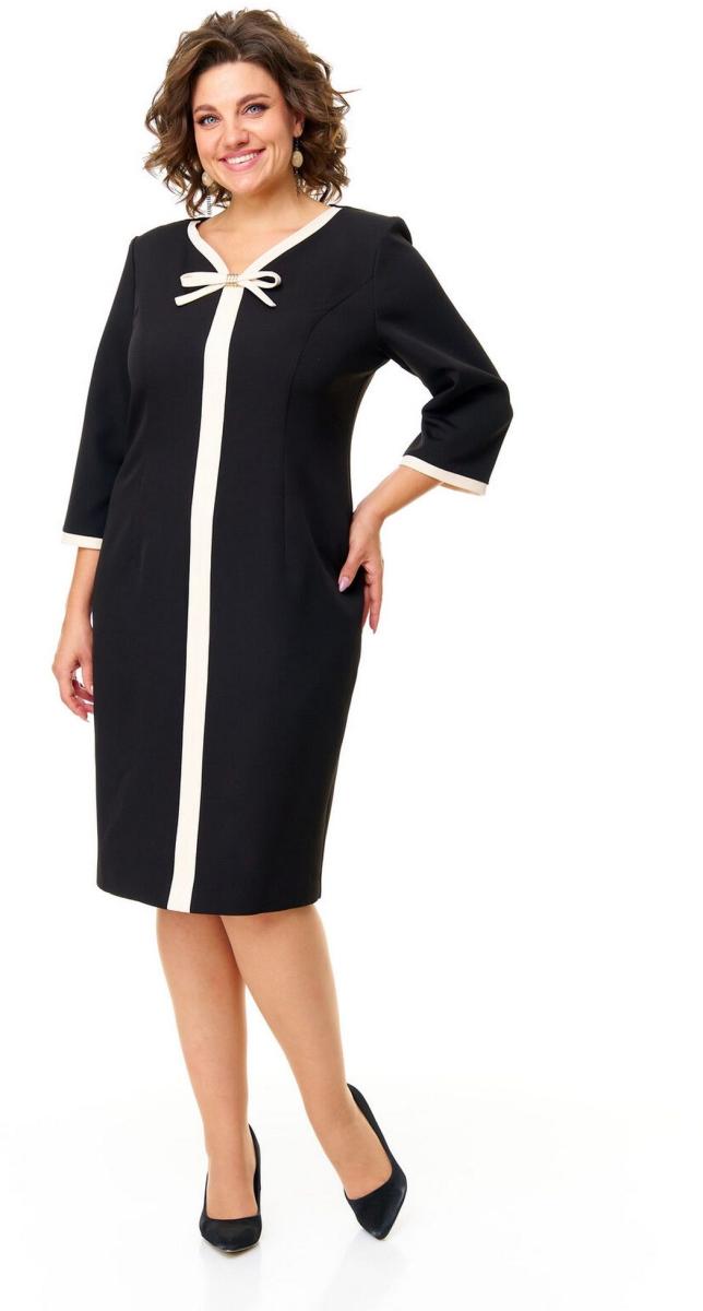 Платье женское полуприлегающего силуэта с естественной линией плеча. Рукав 3/4 втачной одношовный с контрастным кантом по низу. Горловина оригинальной авторской формы с контрастным кантом переходящим в планку по переду. По переду выполнены полурельефы выходящие из пройм. Спинка с вытачками. В среднем шве спинки застежка на потайную тесьму-молнию и шлица. На мысик горловины пришита золотистая протяжка, в которую вставлен бантик контрастного цвета.