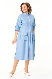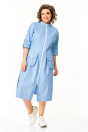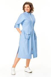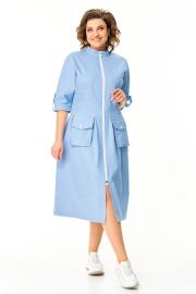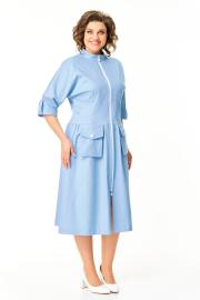 Платье женское полуприлегающего силуэта с легким расклешением к низу. Рукав цельнокроеный типа "летучая мышь" длиной 3/4. Низ рукава с отложной манжетой и патой. Горловина обработана воротником стойка. Перед с застежкой на тесьму-молнию. По переду и спинке выполнен ряд декоративно-конструктивных рельефов для придания силуэтности платью. Рельефы подчеркнуты отделочными строчками контрастного цвета. Нижняя часть платья с легкой сборкой. По переду, в шов притачивания нижней части платья, вставлены отлетные карманы с клапаном. В боковых швах имеются карманы.