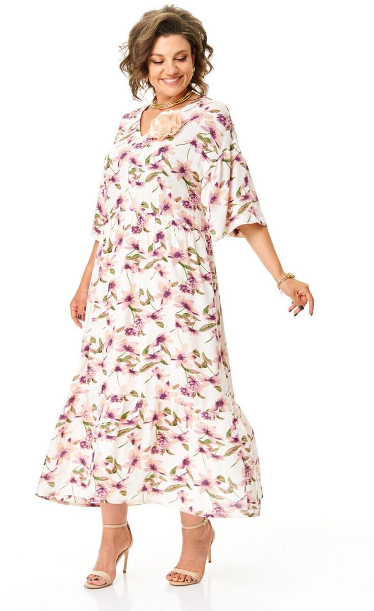 Платье женское А-образного силуэта со спущенной линией плеча.По окату рукава обработана сборка.Горловина V-образной формы.В среднем шве спинки застежка на тесьму-молнию.Перед и спинка выполнена последовательными оборками создающими легкое расклешение низу.В боковых швах обработаны карманы.В комплект входит съемная брошь в виде цветка.