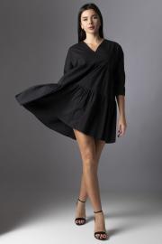 Платье женское, свободного силуэта, выполнено из хлопкового полотна.   Горловина V-образной формы. Передняя и задняя часть с двумя отрезами и мелкой сборкой по всему изделию. Плечо спущенное. Длина изделия:  82см.    Длина рукава: 41см.    Уход: ручная стирка при температуре не выше 30 С.